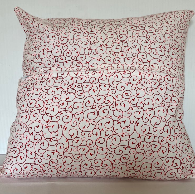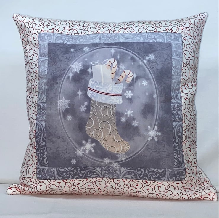 Featuring a lovely Christmas Stocking in the centre in red, white and silver. The back is in the same red and white swirls as featured on the outer edge of the front and has a concealed zip fastening for easy insertion and removal of the cushion pad (not supplied).