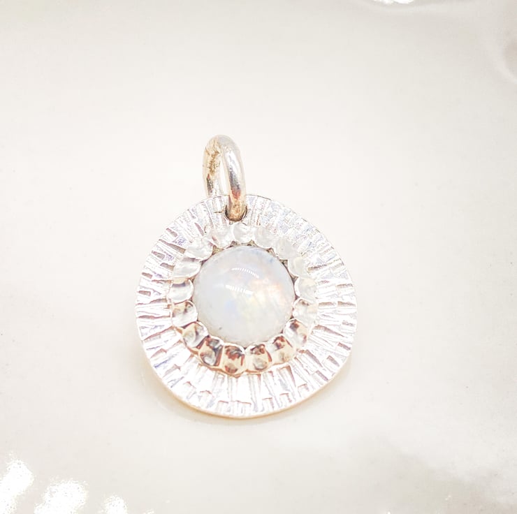 Sterling silver pendant, in a pretty unique design with an 8mm rainbow moonstone. Handmade by me in my home studio using traditional metal smithing techniques.