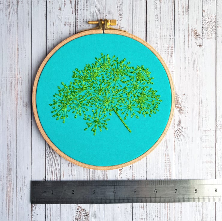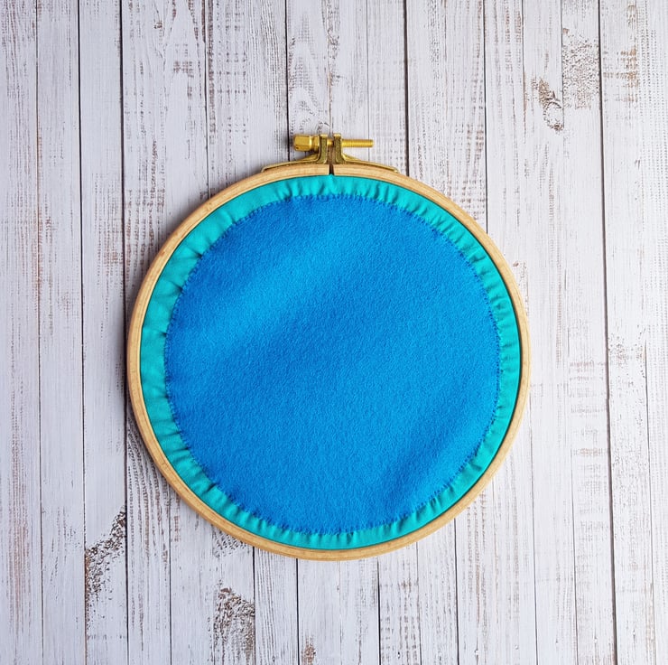 Mounted in a 6.5" (approx 17 cm) embroidery hoop.