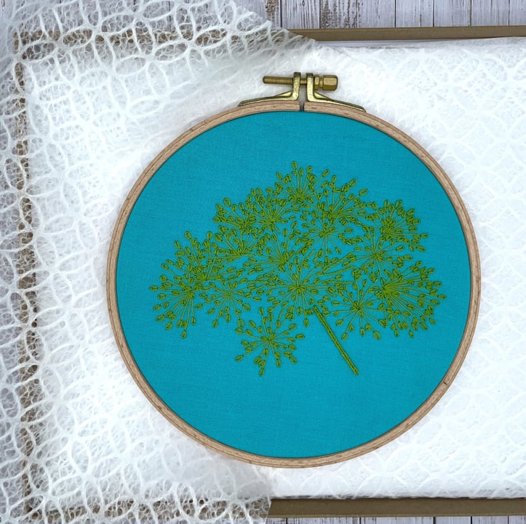 Lime green seed heads on a deep turquoise background. A finished piece of embroidery art in bright tropical colours.
