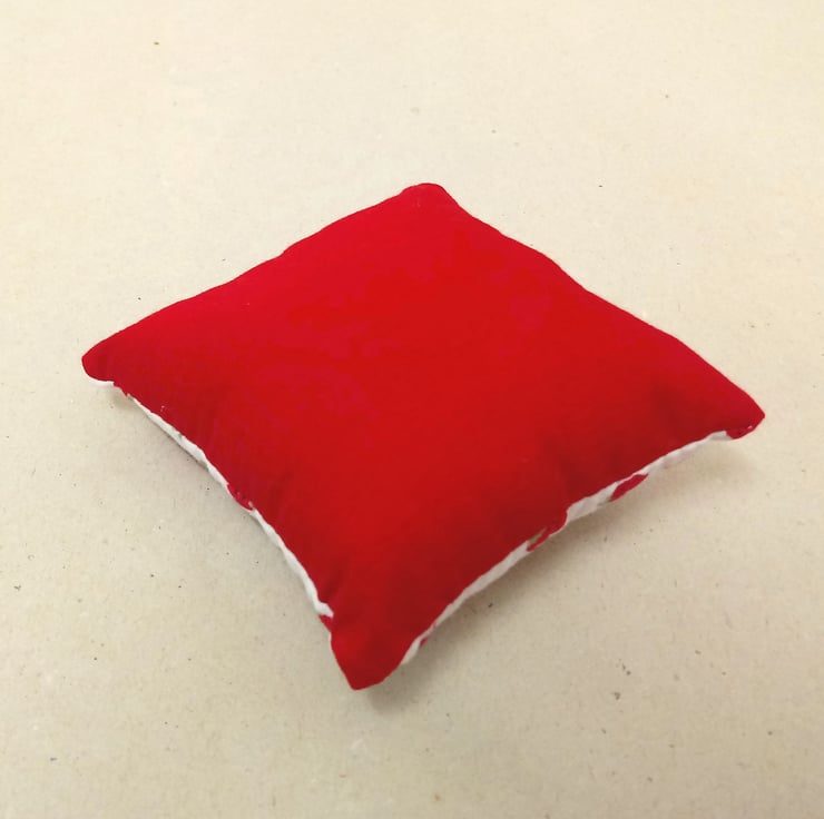 It is plain red on the reverse, firmly padded with stuffing and handmade in a square shape.