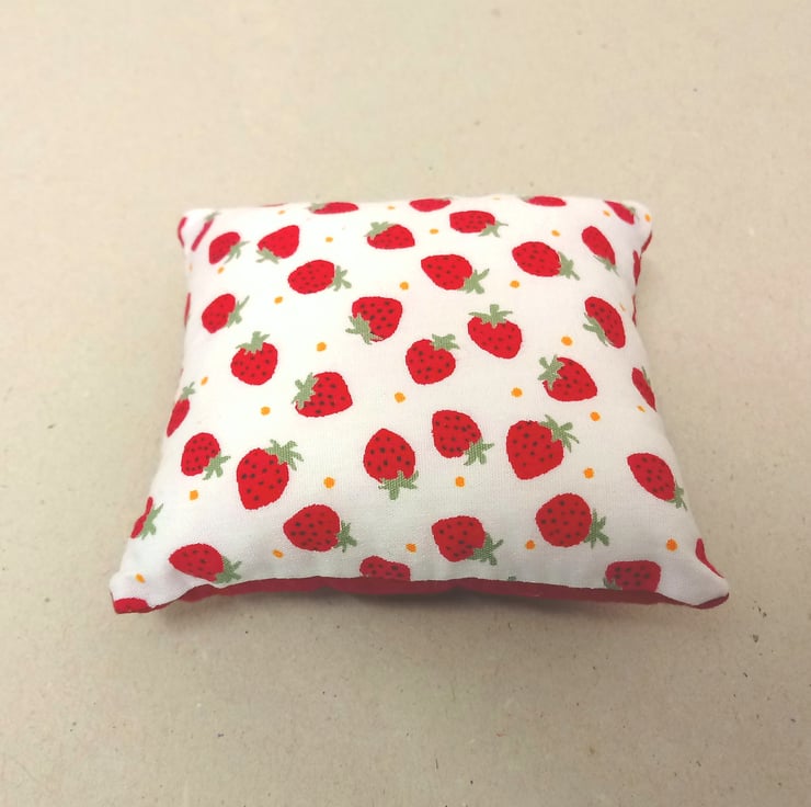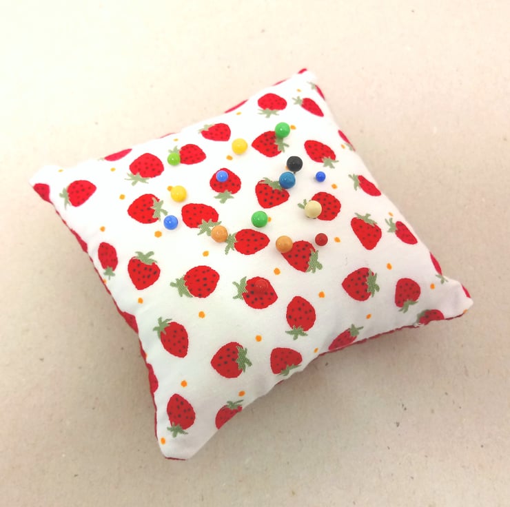 This is a lovely pin cushion, handmade in white with small red strawberries.