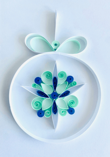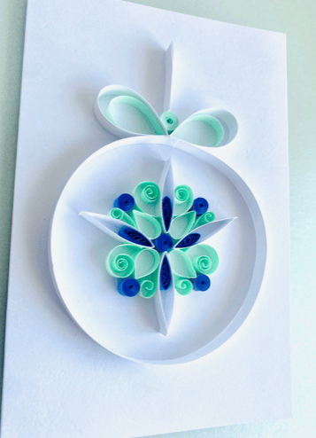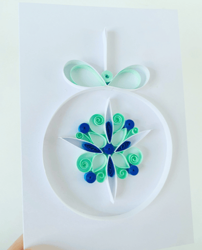 This card is handmade using paper strips to create a striking snowflake design which has been delicately quilled to create a beautiful 3D effect Christmas bauble design.