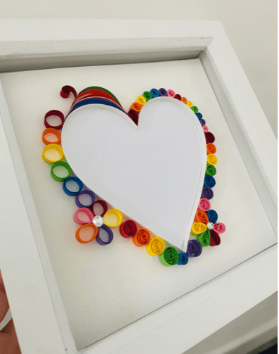 Show your love with this beautiful Paper Quilling rainbow LOVE heart mounted in a shadow box frame.