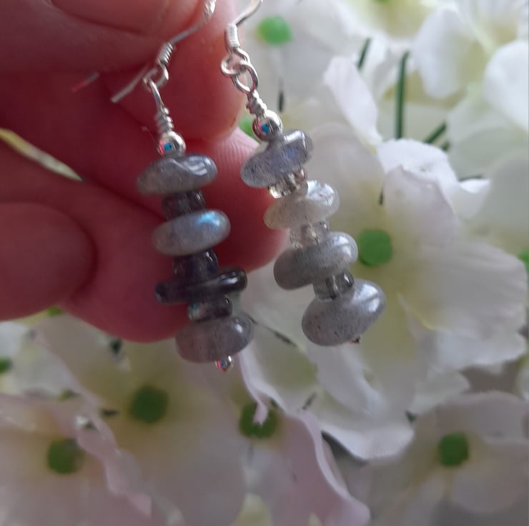 Labradorite semi precious gemstones in a grey colour which have lovely flashes of blue as they move in the light are attached to sterling silver ear wires.