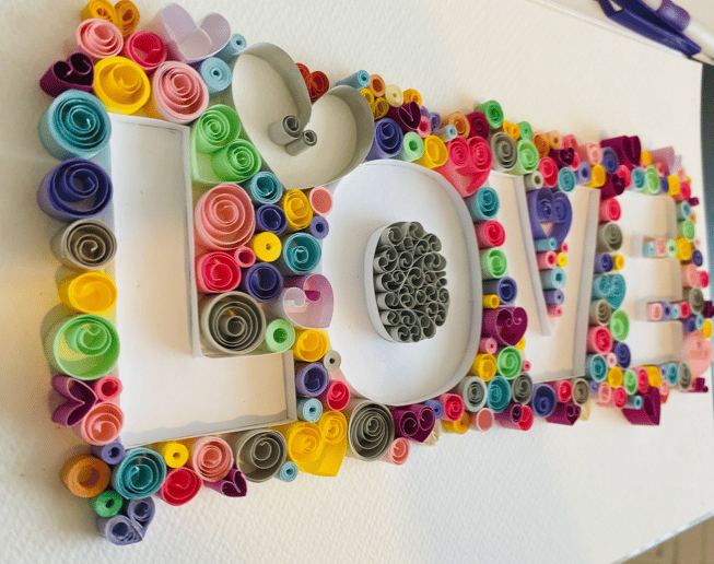 Uniquely handmade quilled LOVE wall art in frame, perfect for home decor