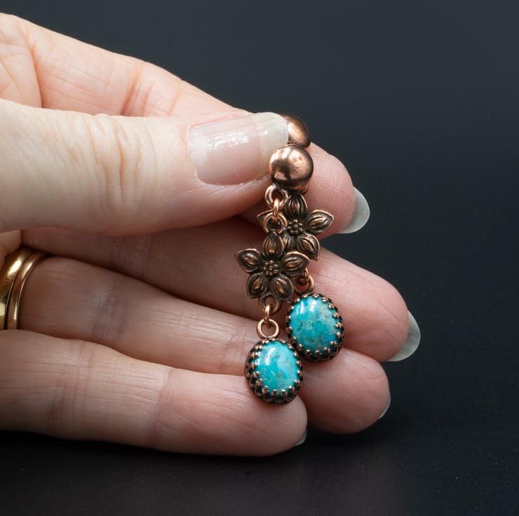 Beautiful 10 x 8mm turquoise cabochon stones are set in an antique copper plated setting and hang below pretty antique copper flower connectors. Ear wires are antique copper plated 7mm round domed studs. The ear posts are titanium.