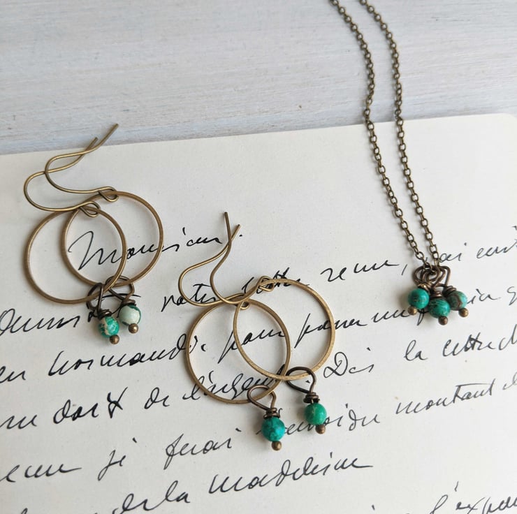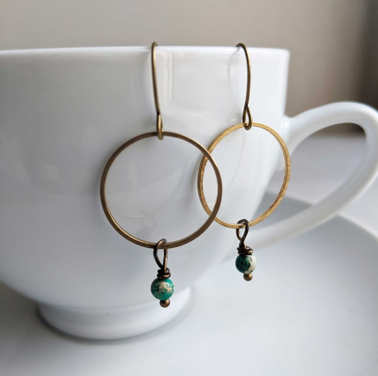 Beautifully fine golden brass hoops, with African turquoise gemstone drops.