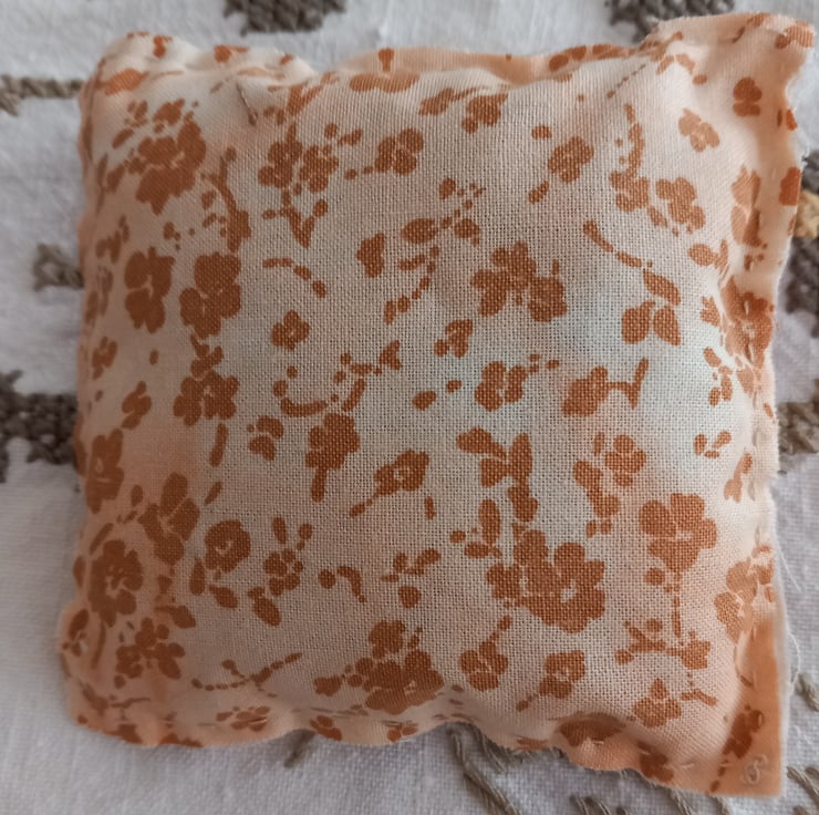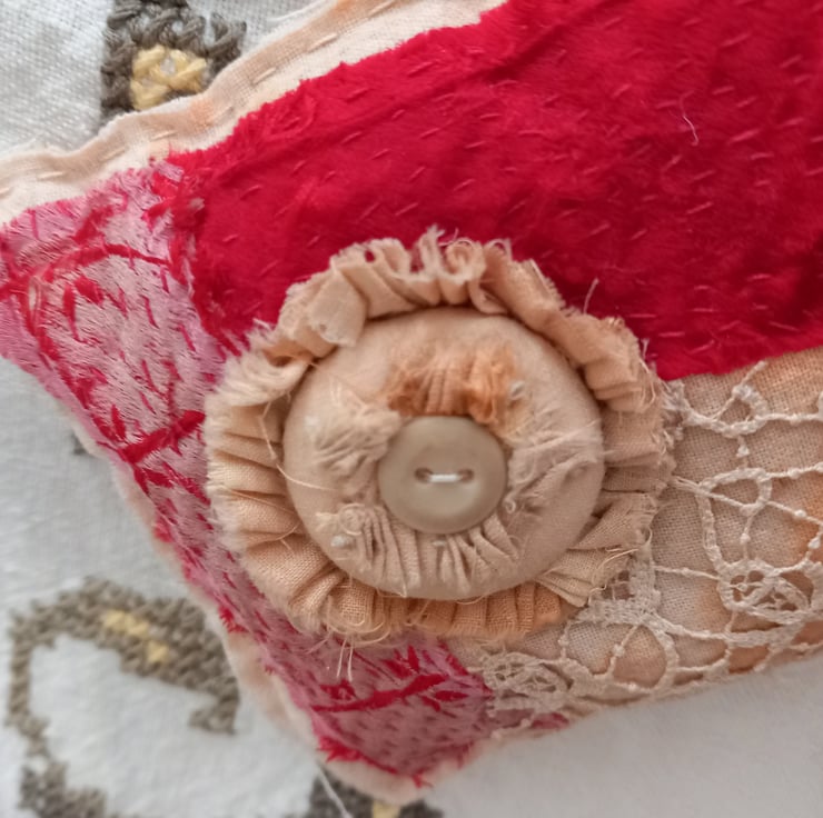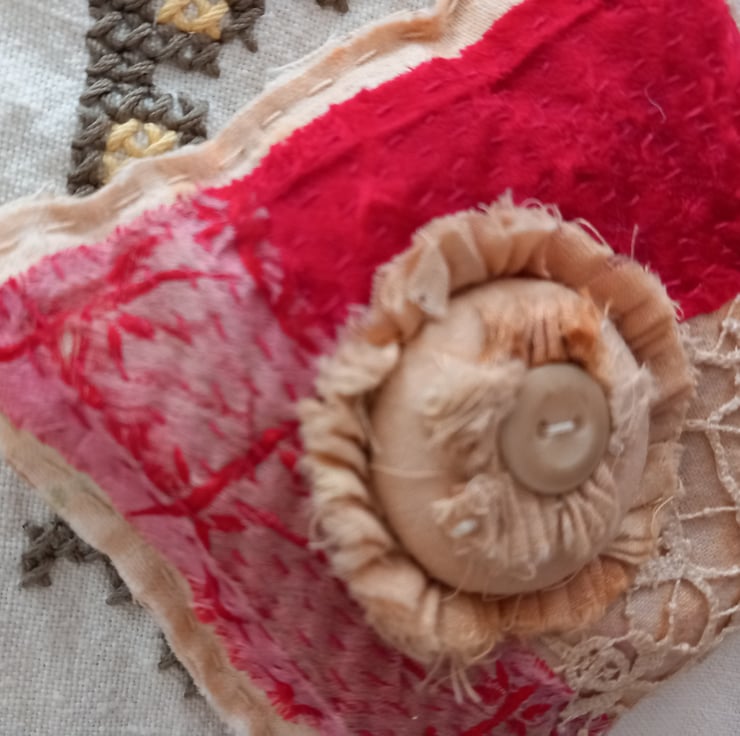 I've made this lavender pillow using tea-dyed fabric that I've decorated with a button that I created as part of my 2020 100 day project. I also added two pieces of slightly tattered silk recovered from a damaged quilt, and a piece of antique lace.