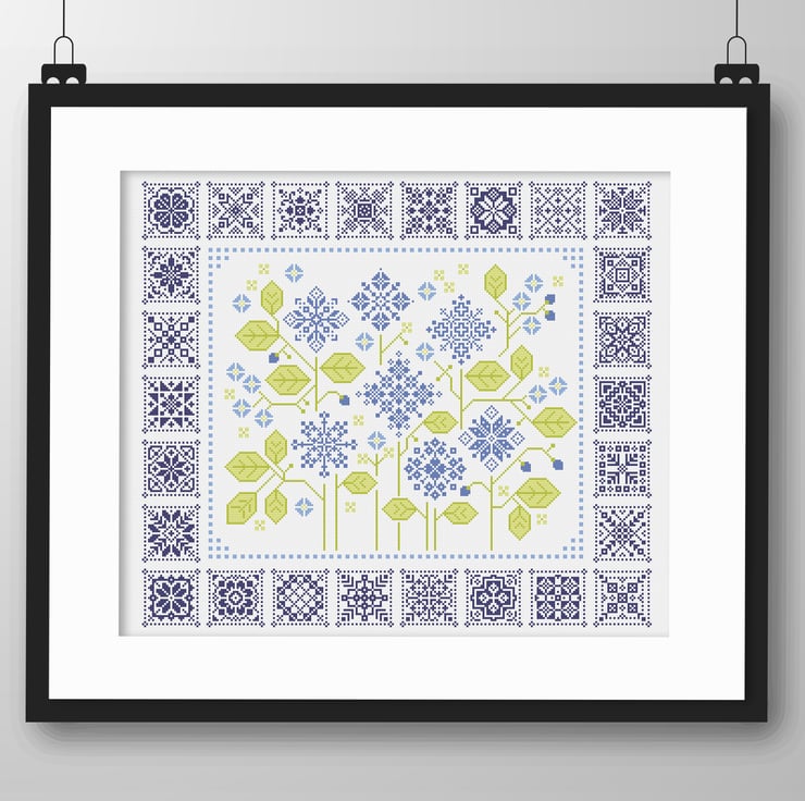 Cross Stitch pattern Quaker Sampler Morning Glory Flower Meadow patchwork squares frame Modern Folk Art by Vivsters - PDF counted chart 143