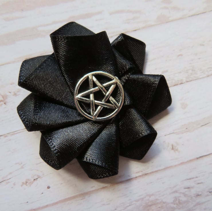 Created with a small satin ribbon ruffle with a silver (zinc alloy) pentagram charm.
