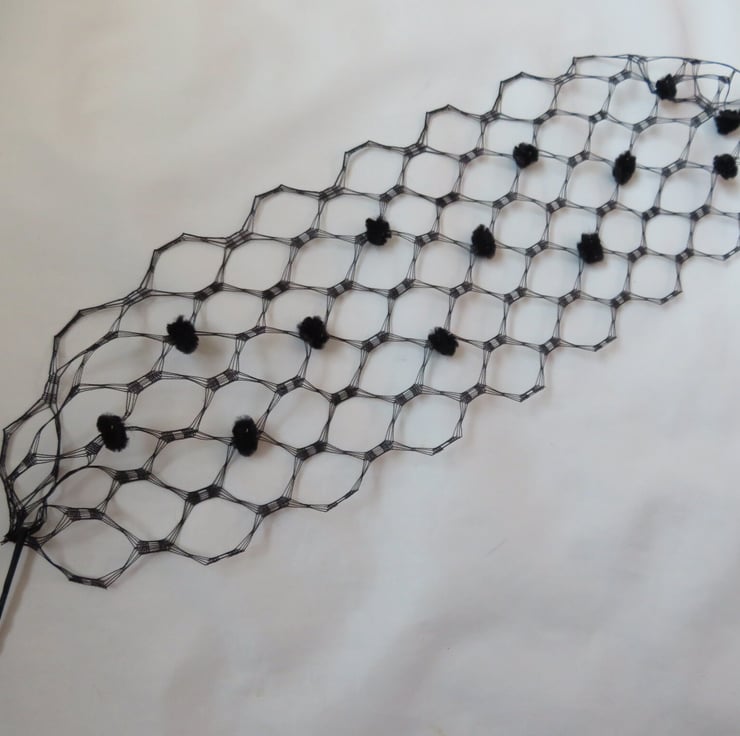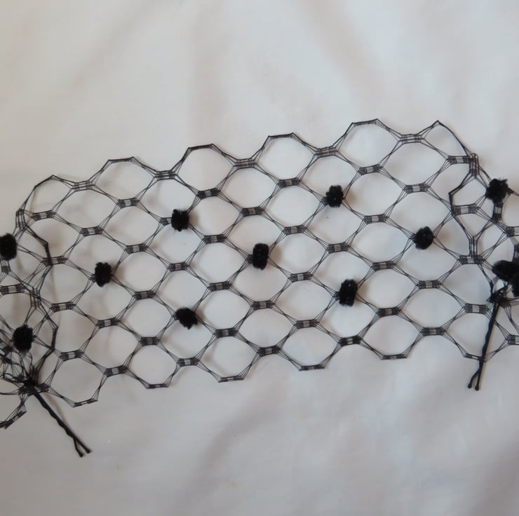 This is a narrow bandeau style eye veil made from soft dramatic vintage waffle weave veiling with added black chenille spots