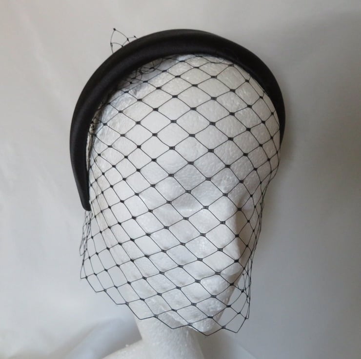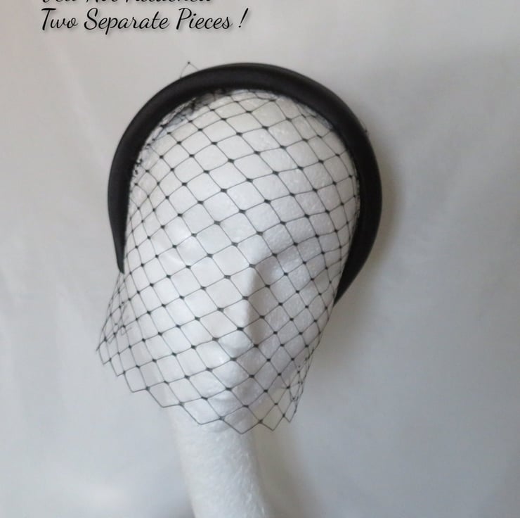 This listing is for a set of a headband and short black merry widow or classic face veil.
