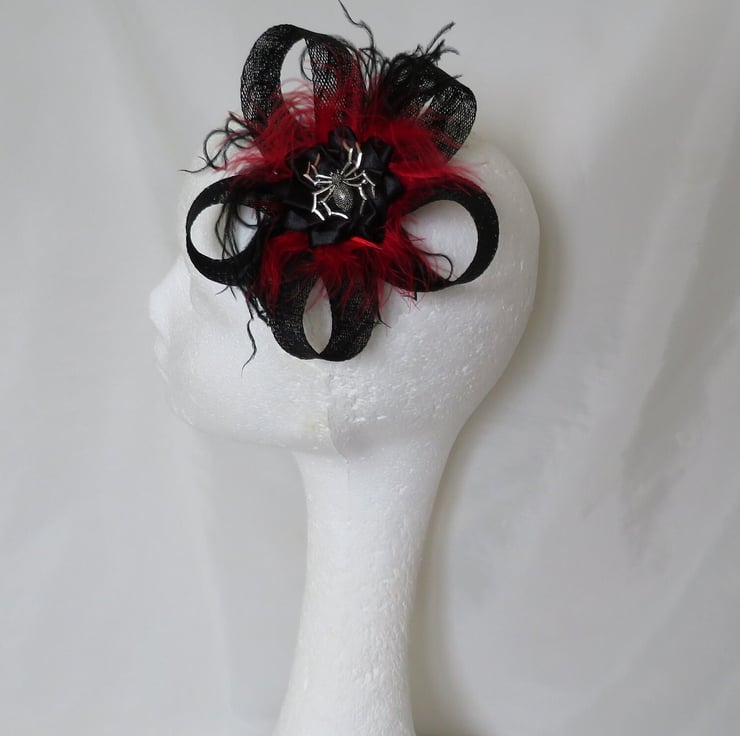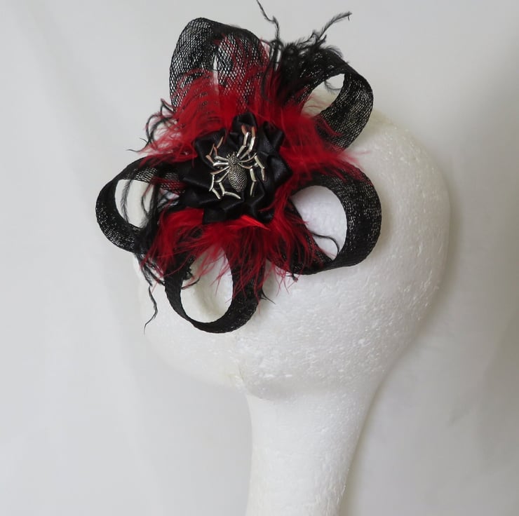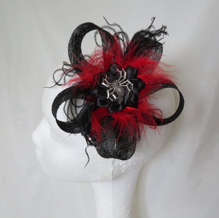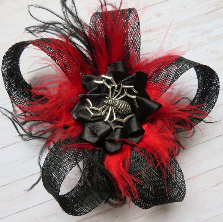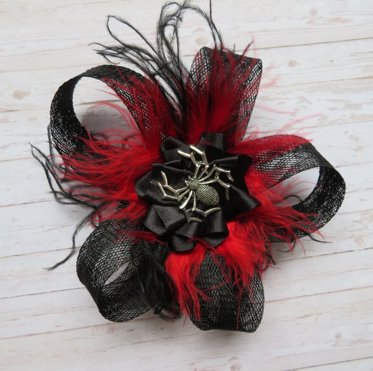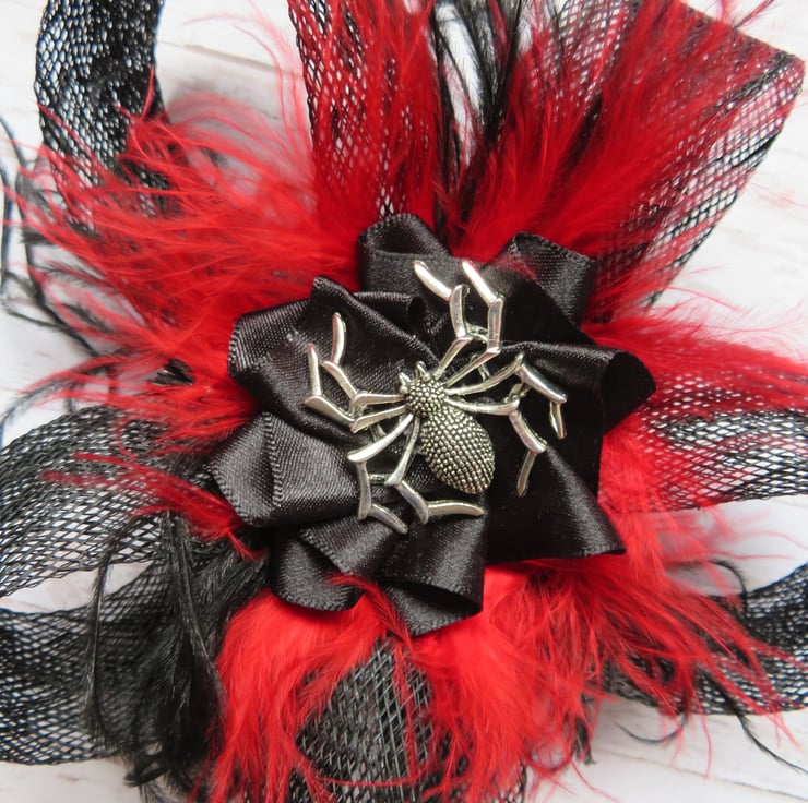 Complemented with black & red fluff feathers and black & red curled ostrich fronds and finished with a black satin ribbon ruffle with a silver spider charm.