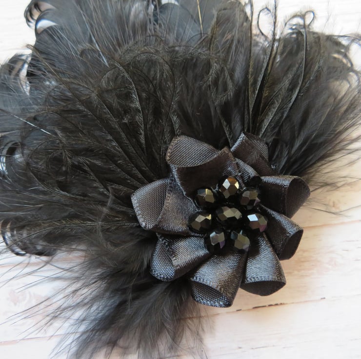 Created with curled black turkey feathers, black fluff feathers and curled ostrich fronds.