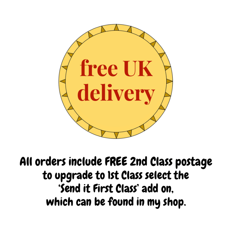 If you would like it to go 1st Class please add 'Send It First Class' listing to your basket which can be found in my shop.