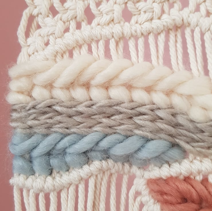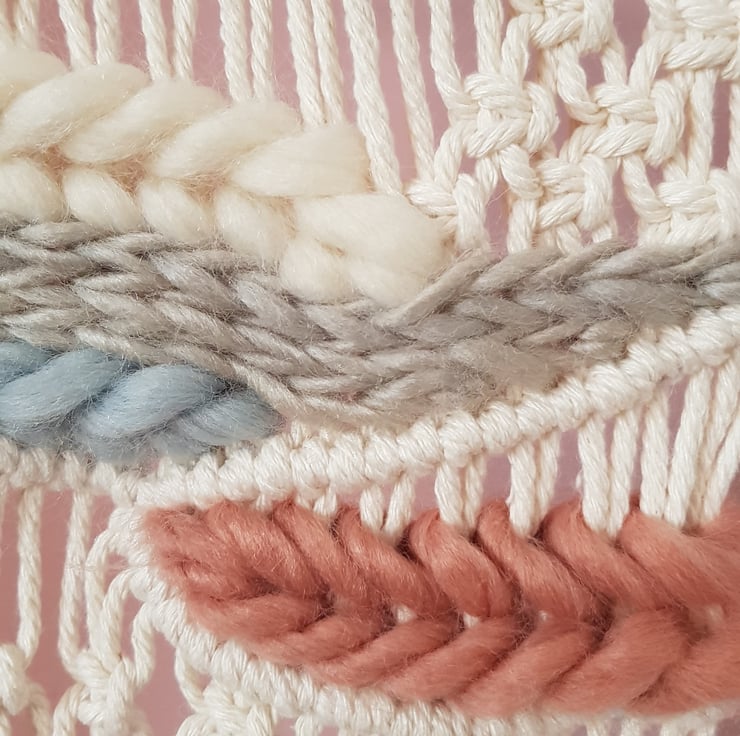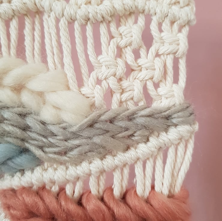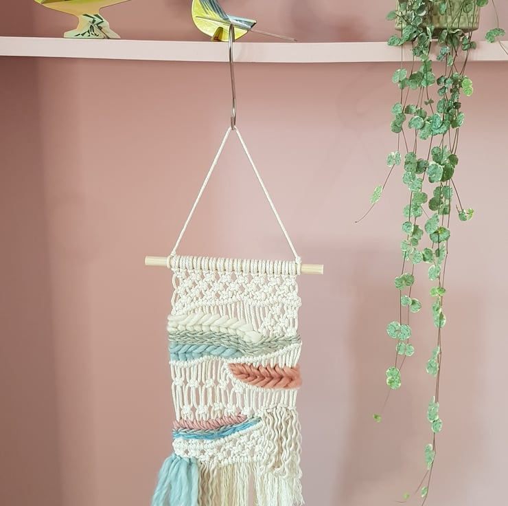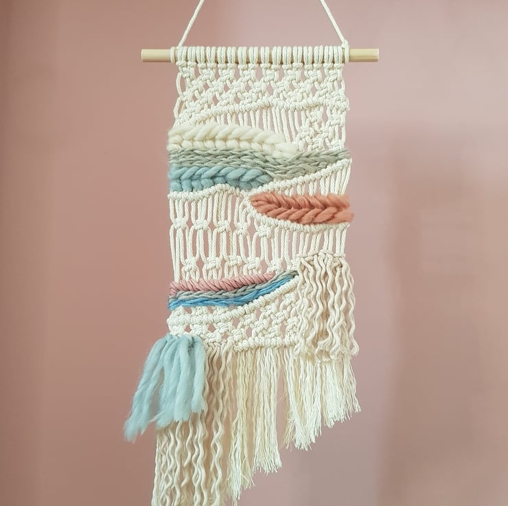 This beautifully handmade Macraweave wall hanging is made from 100% Cotton cord, a mix of wool including Merino and is hung from a wooden dowel. It is 16cm in width and 45cm in length (not including the hanging loop)