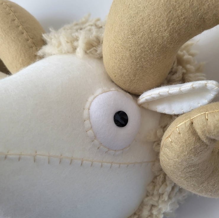 Predominantly made using Felt, with buttons or beads for the eyes and embroidery cotton for the decorative stitching. Each head is filled with fibre fill wadding, and is backed with an inner disc of mount board for strength so it hangs neatly on the wall from a metal D loop at the back.