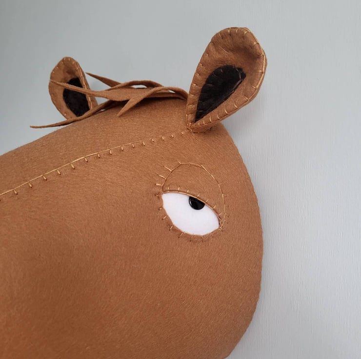 Predominantly made using Felt, with buttons or beads for the eyes and embroidery cotton for the decorative stitching. Each head is filled with fibre fill wadding, and is backed with an inner disc of mount board for strength so it hangs neatly on the wall from a metal D loop at the back.