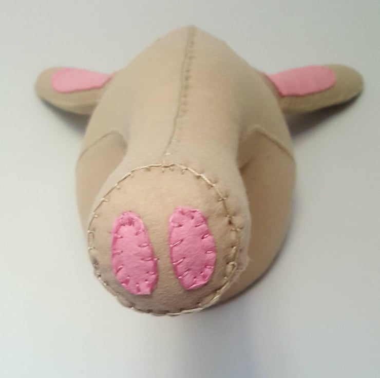 Predominantly made using Felt, with buttons or beads for the eyes and embroidery cotton for the decorative stitching. Each head is filled with fibre fill wadding, and is backed with an inner disc of mount board for strength so it hangs neatly on the wall from a metal D loop at the back.