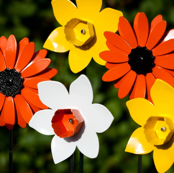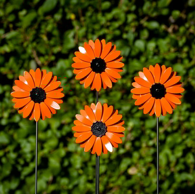 The aluminium petals are shaped, formed and hand finished by Paul, we then have them powder coated for a quality finish. Each flower is assembled by hand, in our home workshop in Cheshire, onto a stainless steel stem.