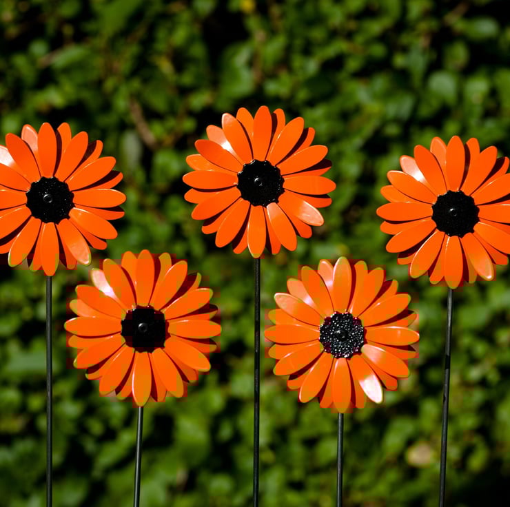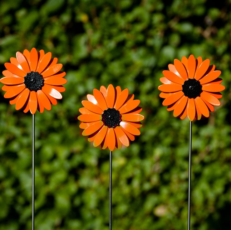 Our bright orange gerbera daisy flower stems are easily pushed into the ground making a colourful display in your flower beds, planters or patio pots, lawn, window box or hanging basket.