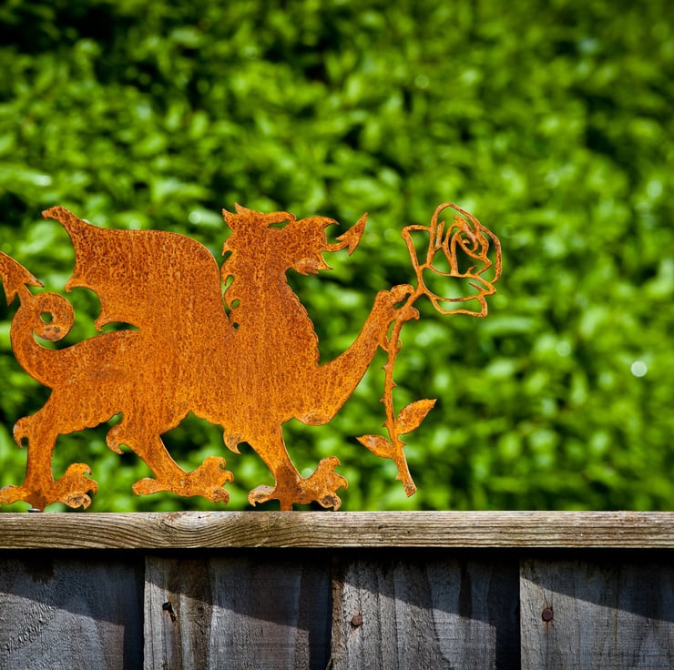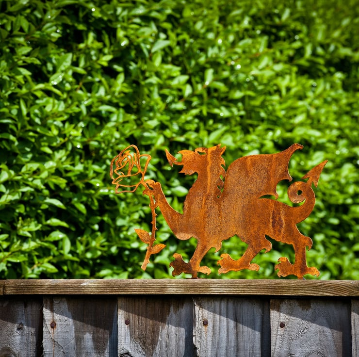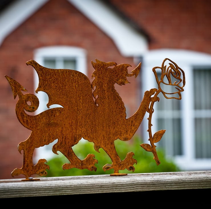 To speed up the rusting process an occasional spray of salty water over the first few days or so will help create the rust effect. Alternatively you could colour your Welsh dragon English rose with metal paint to create your own unique piece of artwork.