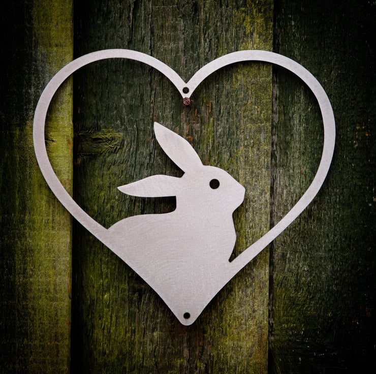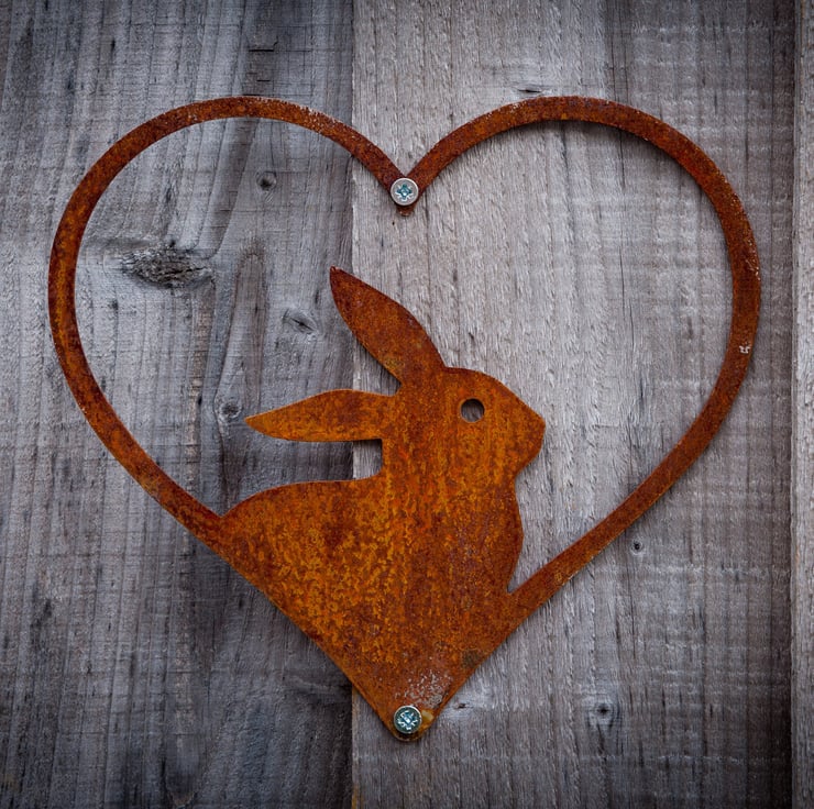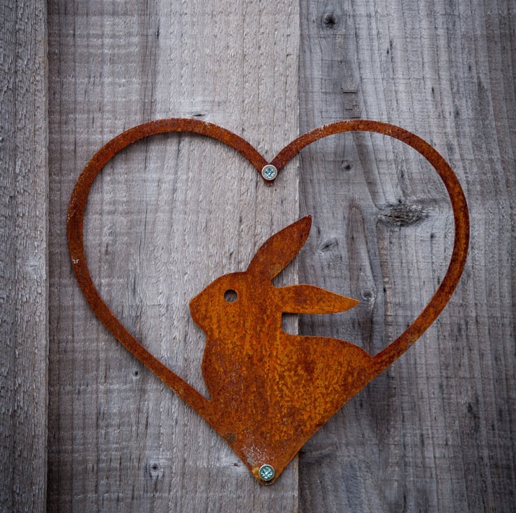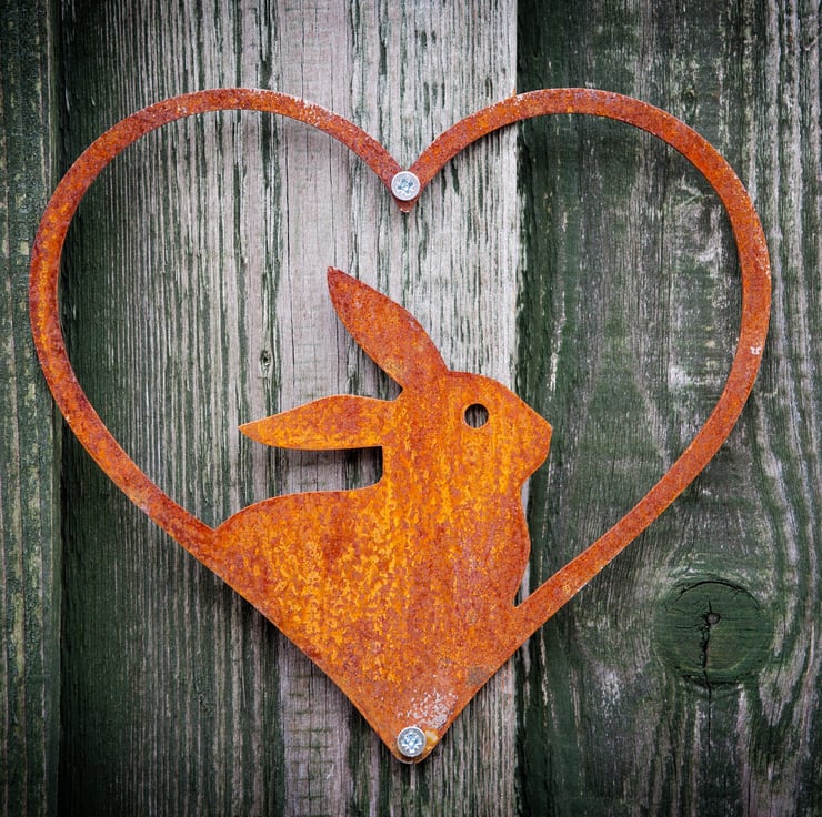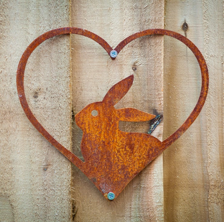 This cute bunny rabbit framed in a heart is a charming decoration for your garden wall, fence, rabbit hutch arbour, pergola, balcony, window box, she shed, man cave, artist's studio or tree and will add style and charm to any garden, patio, terrace, veranda, greenhouse, conservatory, summerhouse, yard, allotment or any outdoor space.