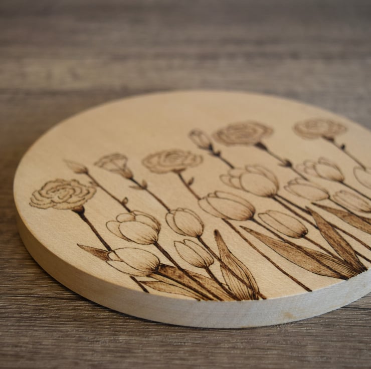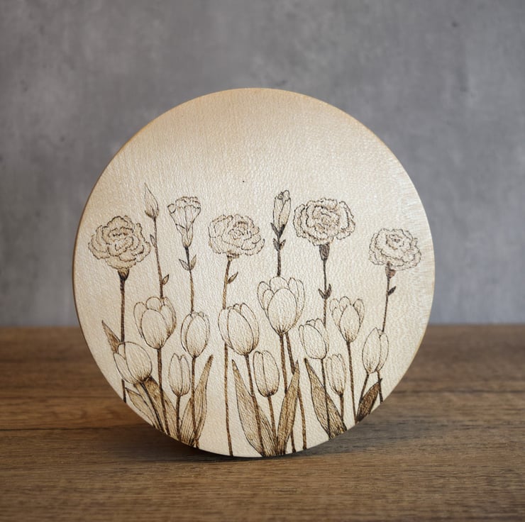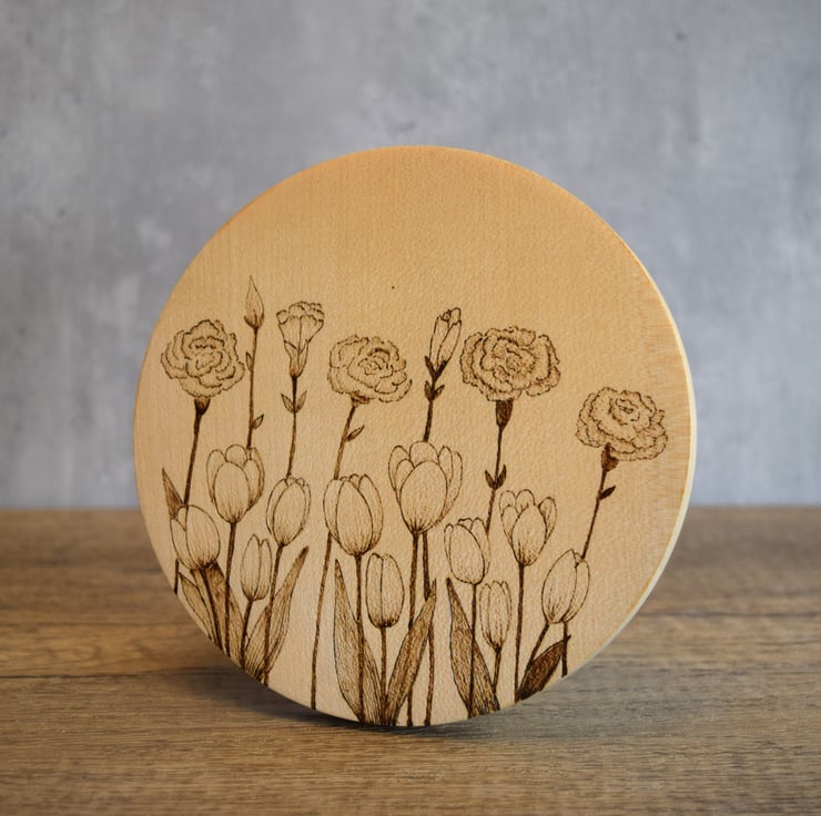 A hand burnt pyrography hangng wall art on Sycamore wood with a Tulips and Carnatioins design.