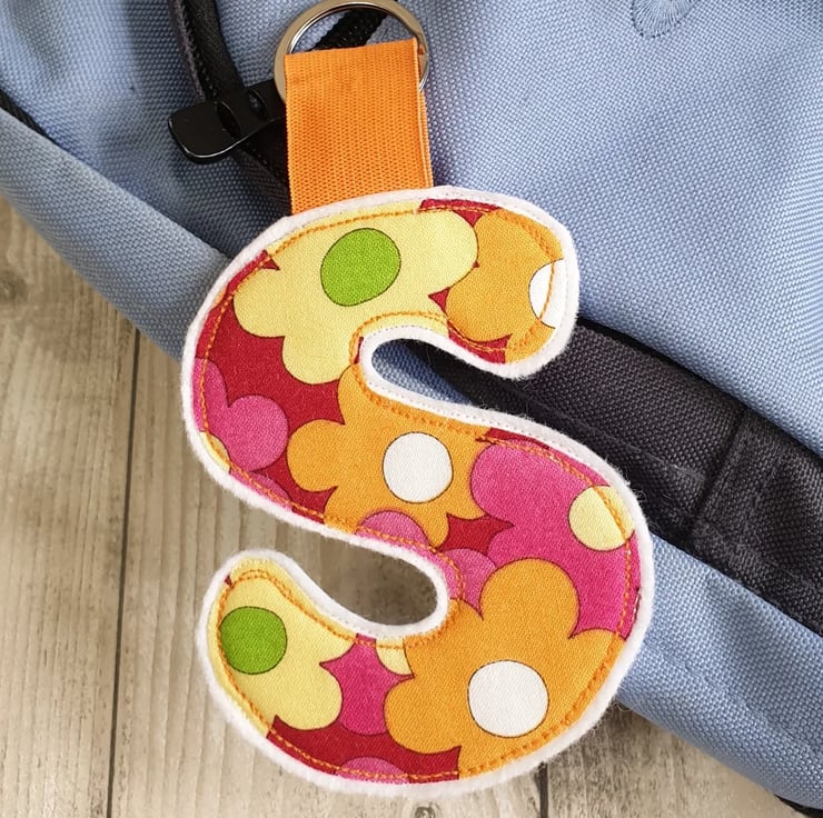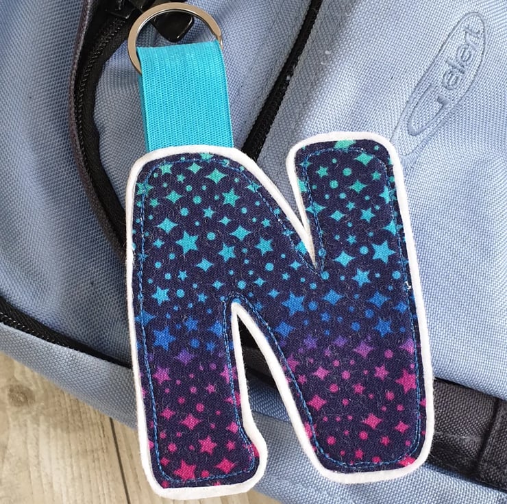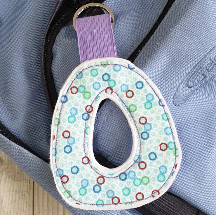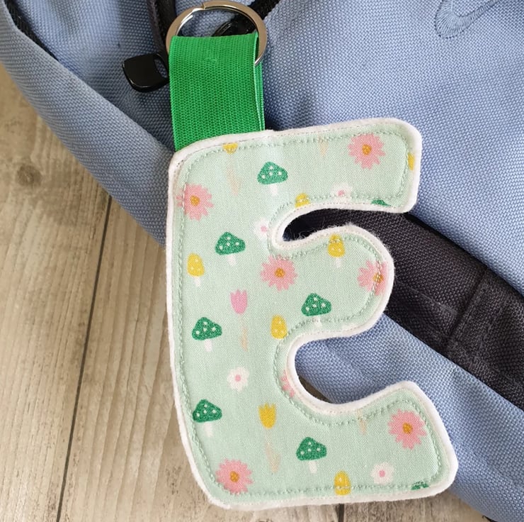 Made from cotton fabric sewn onto two layers of wool felt with a layer of very thick interfacing in between to ensure your tag will stay in good condition all through the school year. Wide colourful elastic is used to give less chance of breakage if tugged. A large split ring is used to give more options of where to attach the tag to the bag.