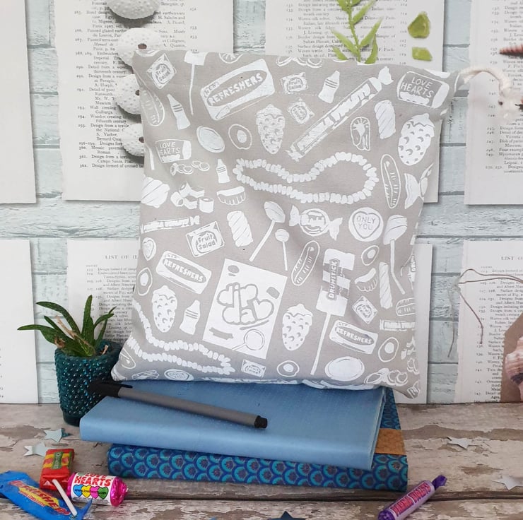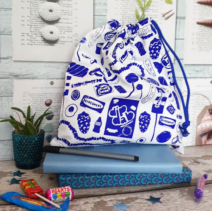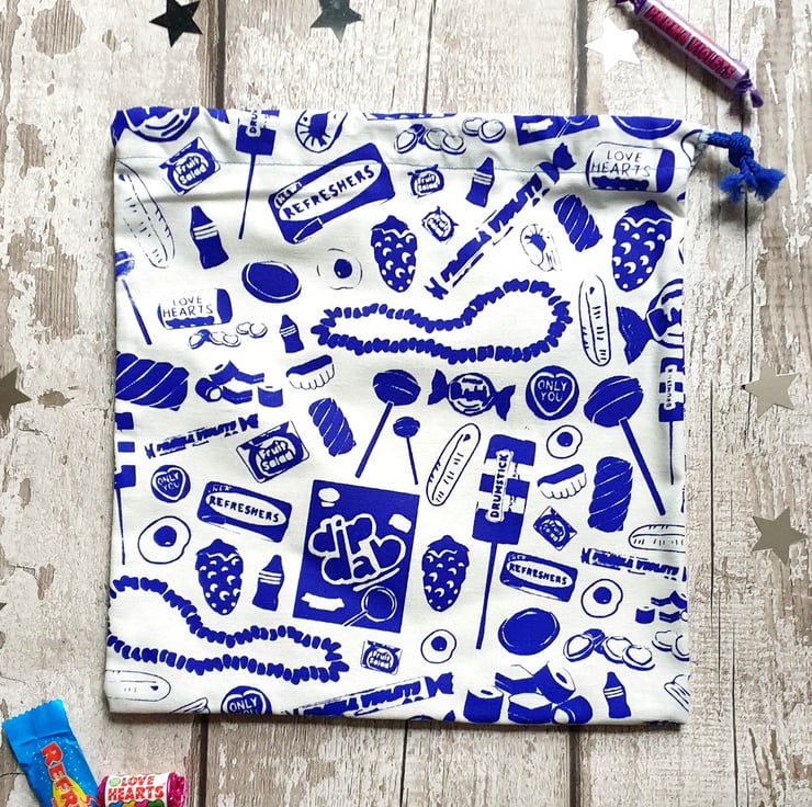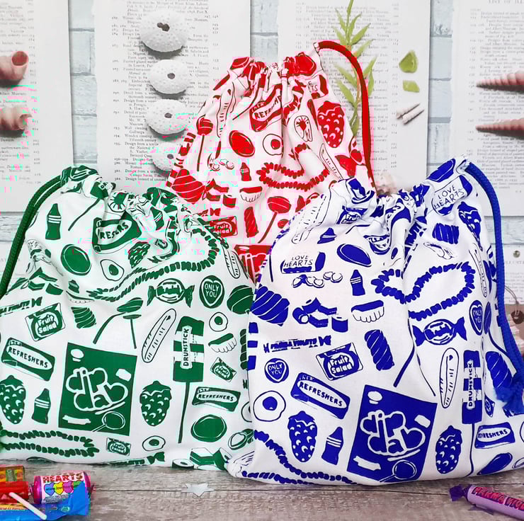 Hand screen-printed cotton canvas drawstring bag featuring my latest Retro Sweets Design!