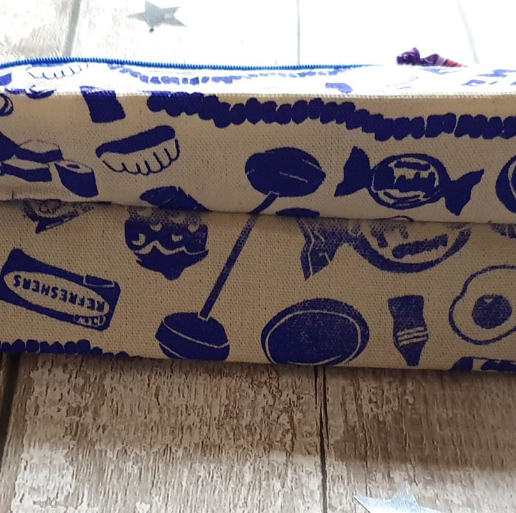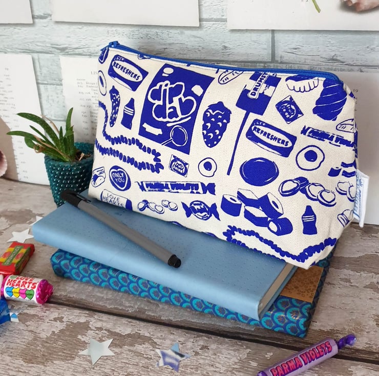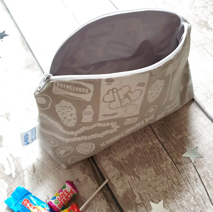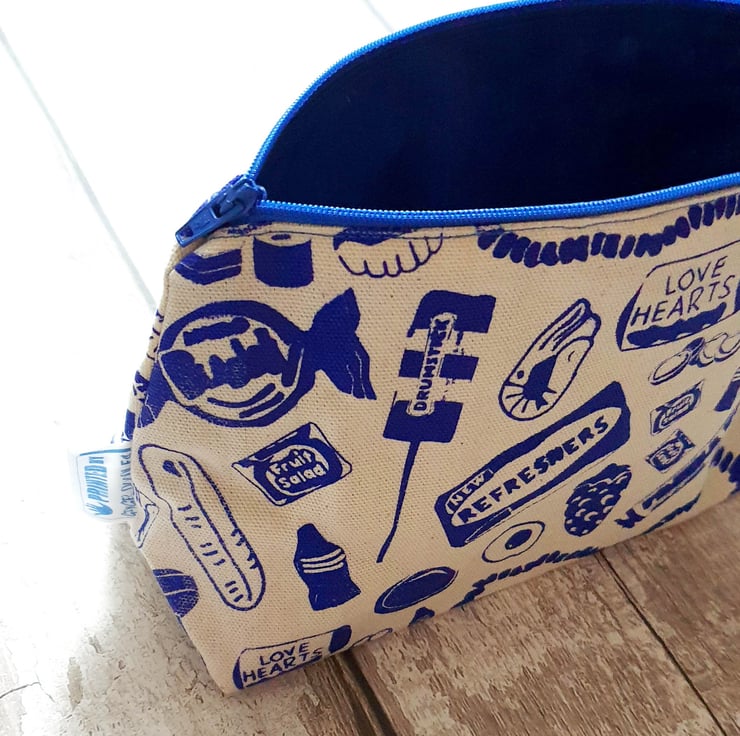 Hand screen-printed cotton canvas wash bag featuring my latest Retro Sweets Design!