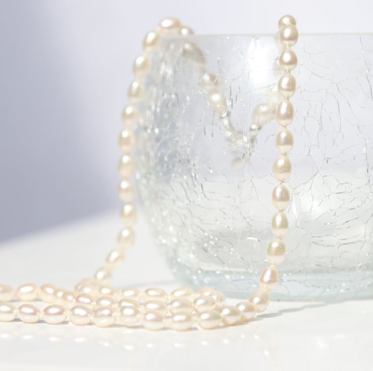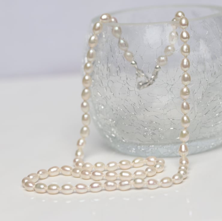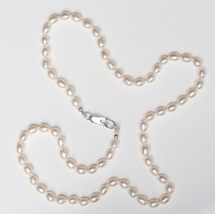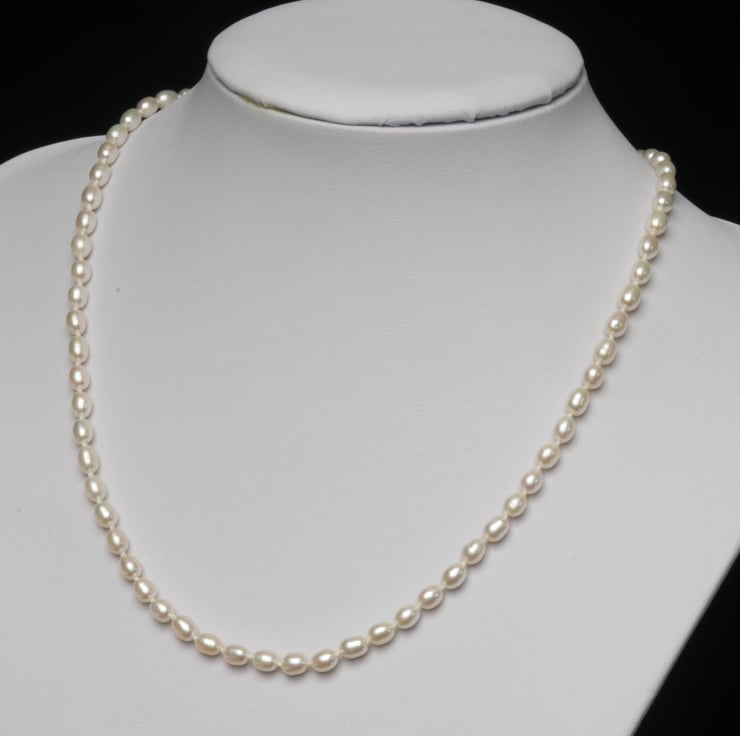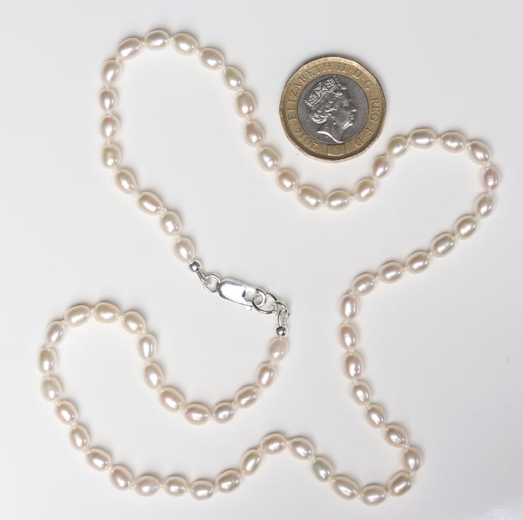 A beautiful little freshwater pearl necklace in a natural pale ivory colour. It would look wonderful on a bride, and equally lovely with a pretty summer outfit. They are fairly small pearls, each 5.5 to 6mm long. The pearls are described as rice pearls: elongated in shape, with a very good surface and lustre. They are of varying shape, but the variations aren’t huge and this only serves to give them an organic and genuine look.