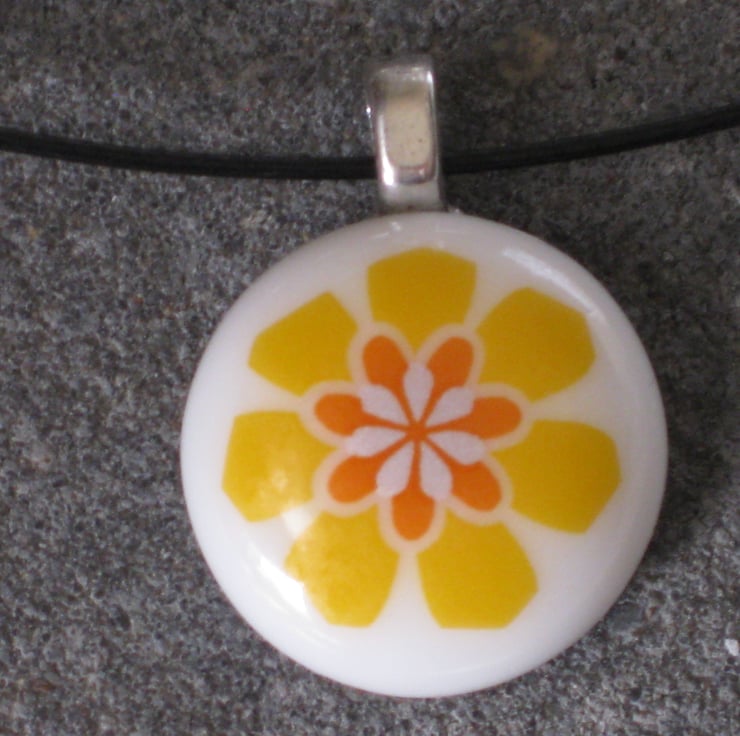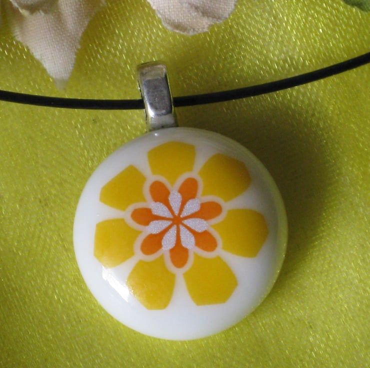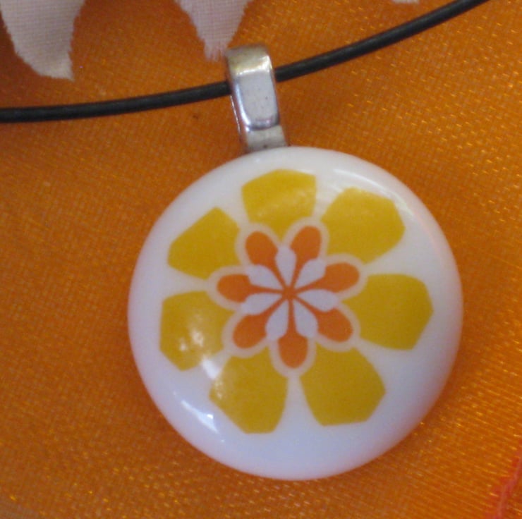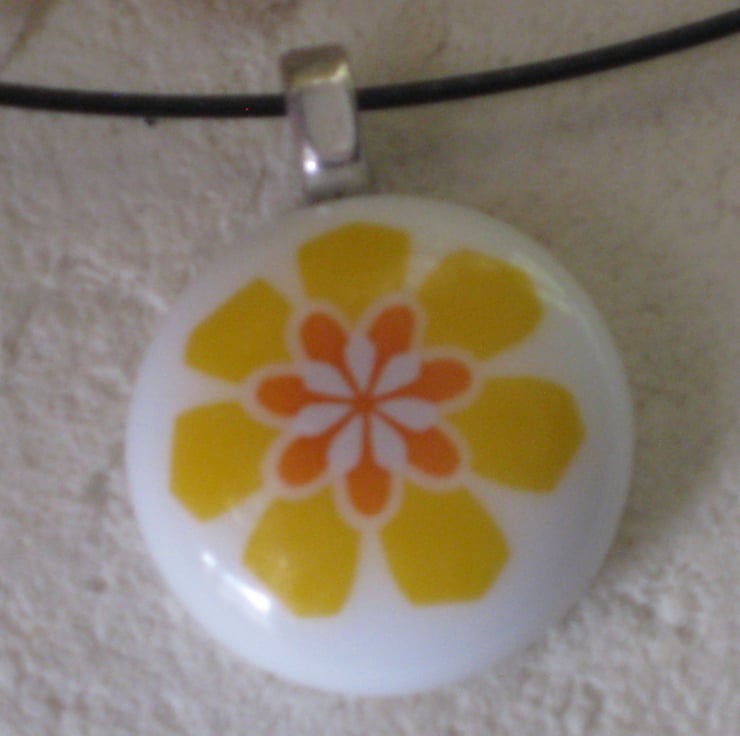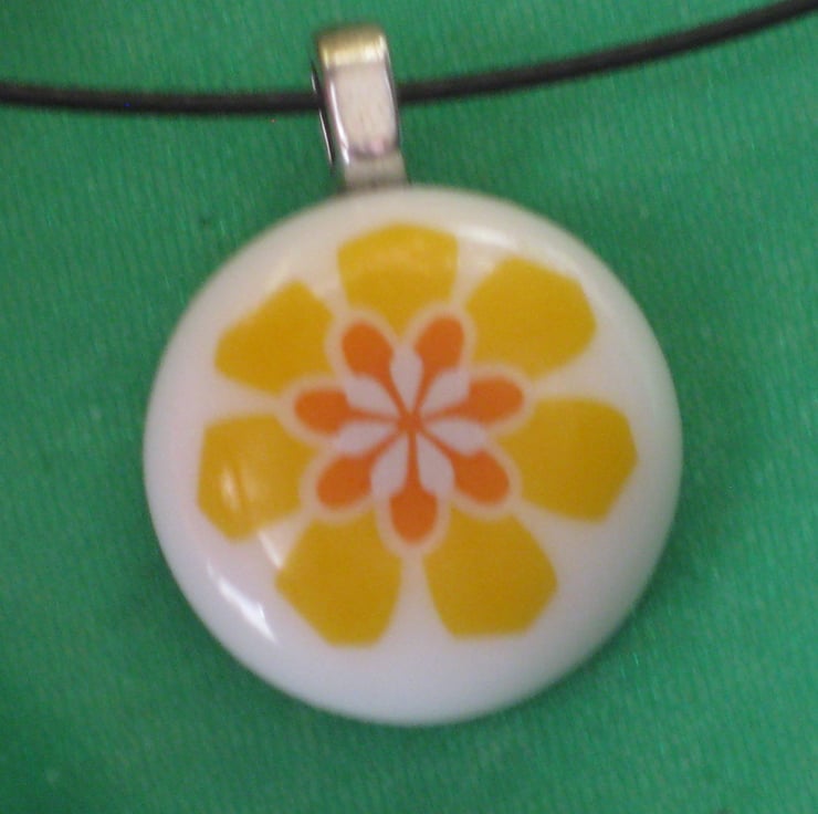 My passion for both flowers and also creating jewellery - especially fused glass jewellery - led me to making several pieces with flower designs on them. I had acquired some lovely white Bullseye glass earlier so for this necklace I began by fusing two pieces together. This formed a perfectly round base - onto which I then added my chosen yellow, orange and white flower.
