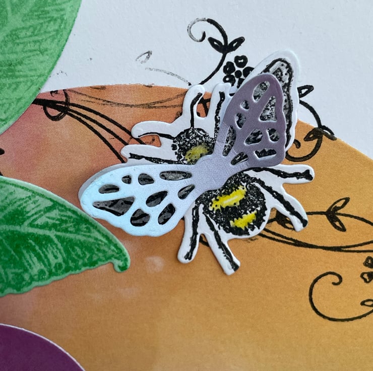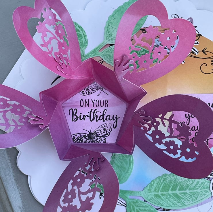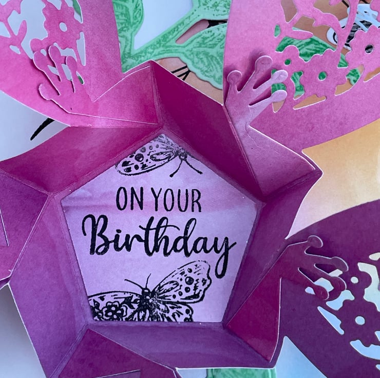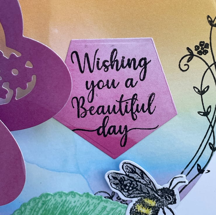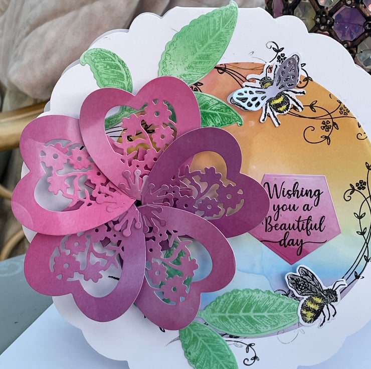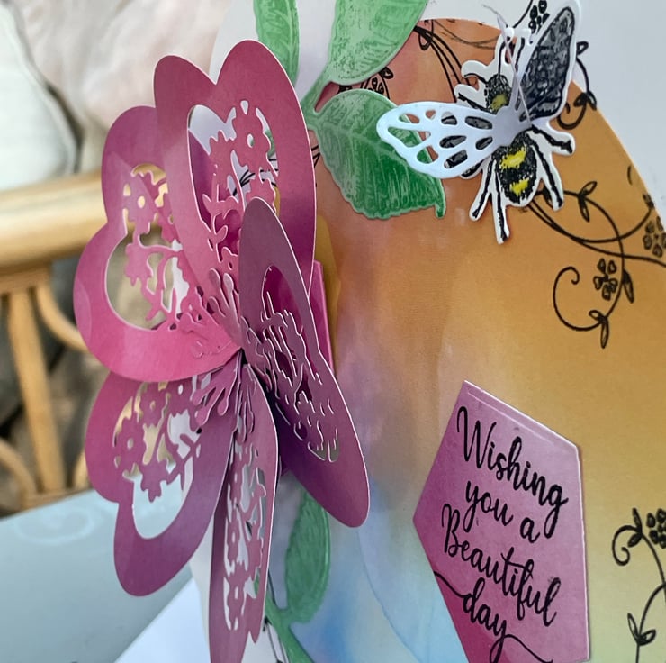 Something a little unusual to celebrate a birthday. This 19x19cm scalloped round card makes an unusual card. It is decorated with a yellow and blue decorative paper circle. This is decorated with stamped swirls. The main feature is a large pink and purple kinetic flower which turns and opens up. The petals are die cut with open flowers. Inside the flower says on your birthday. The greeting on the card says Wishing you a beautiful day. The design is finished with die cut leaves and 2 bees. Inside the card is blank for your own greeting.
