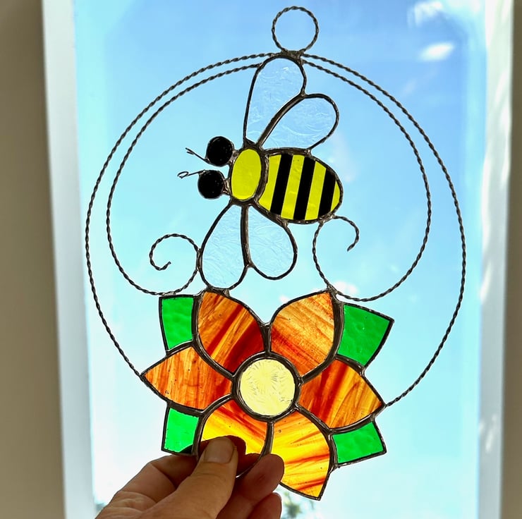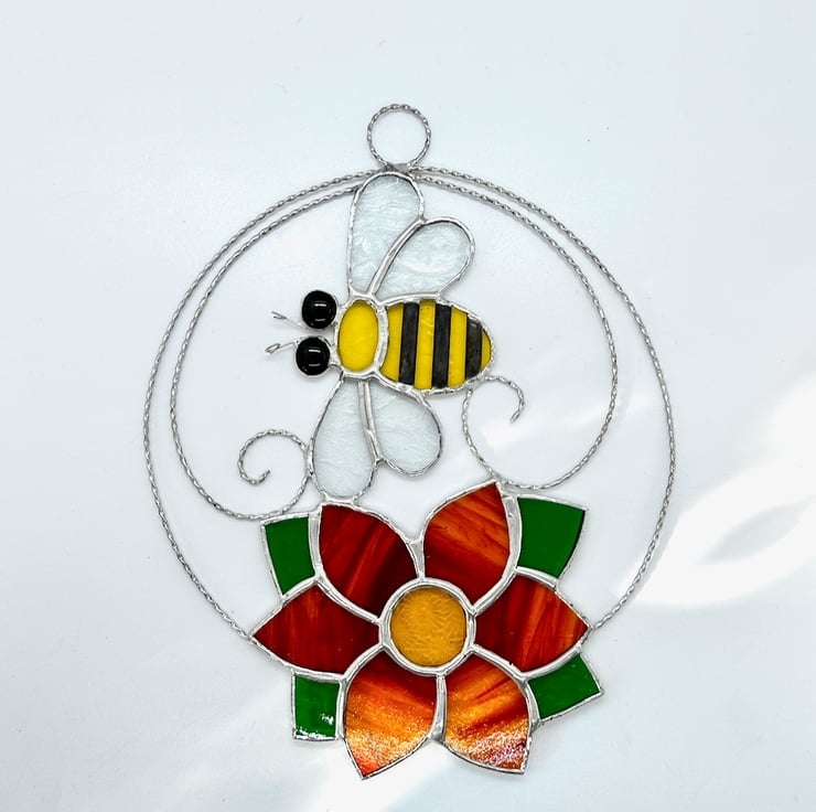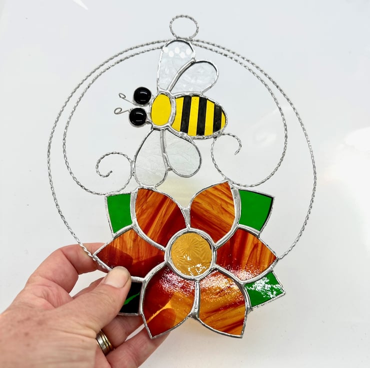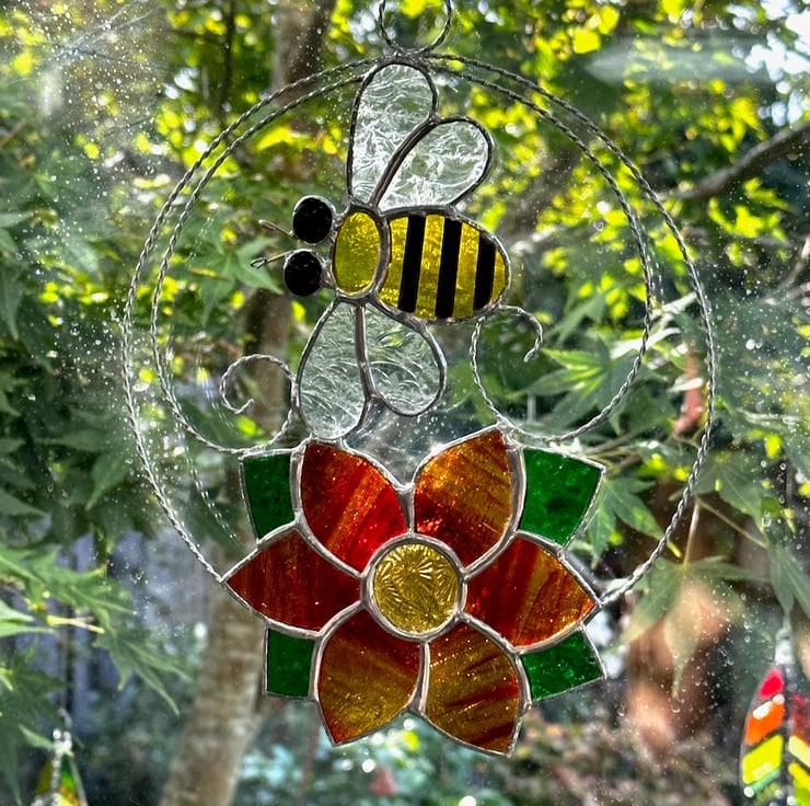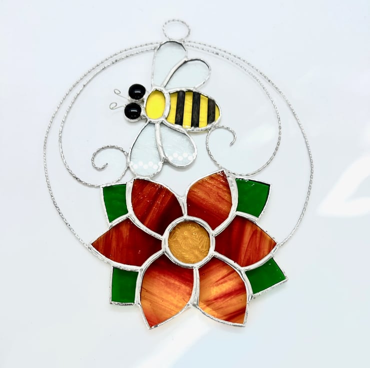 The bee has been made from yellow texture glass, clear glue chip glass for the wings, small black glass nuggets have been used for the eyes. Tinned wire has been used for the antenna. Copper foil has been overlaid no the glass, tinned and patina applied to blacken. The flower has been made from red streaky wissmach glass with amber glass for the centre and a lovely green glass for the leaves. I have used a twisted tinned wire for the circle and scrolls to give a little more structure.
