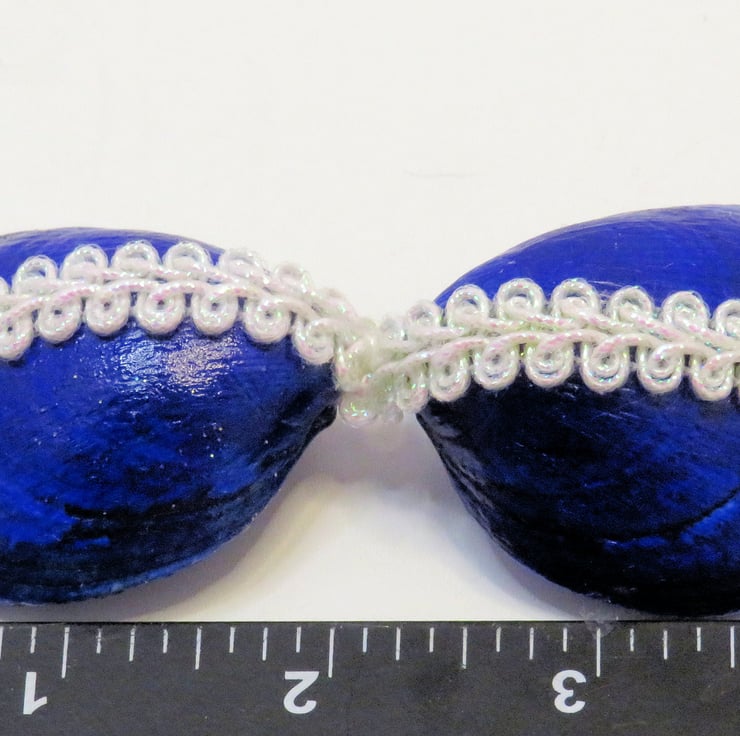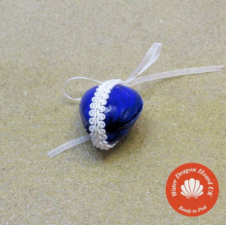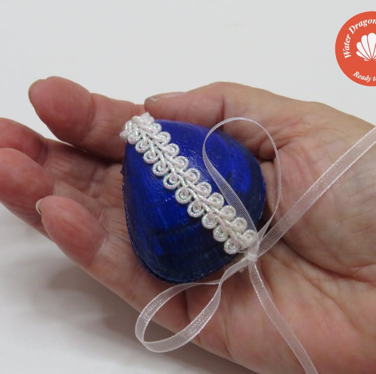 This beautiful and elegant naturally hinged clam shell can hold one ring comfortably and has been painted and adorned with ribbon ties to tie the ring in the box to make sure all is as secure as you can make it.