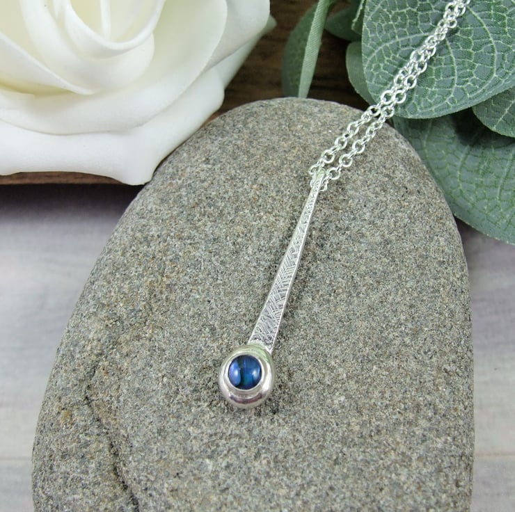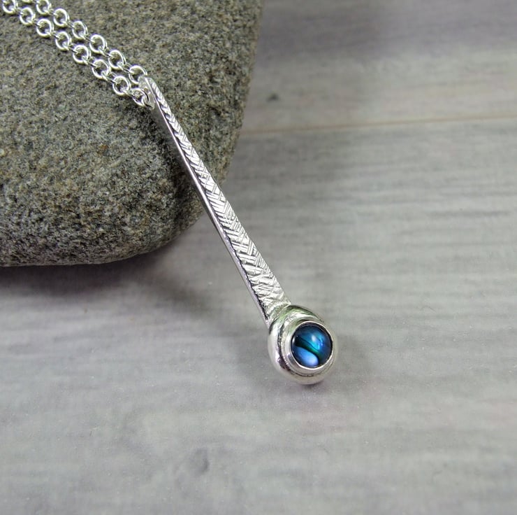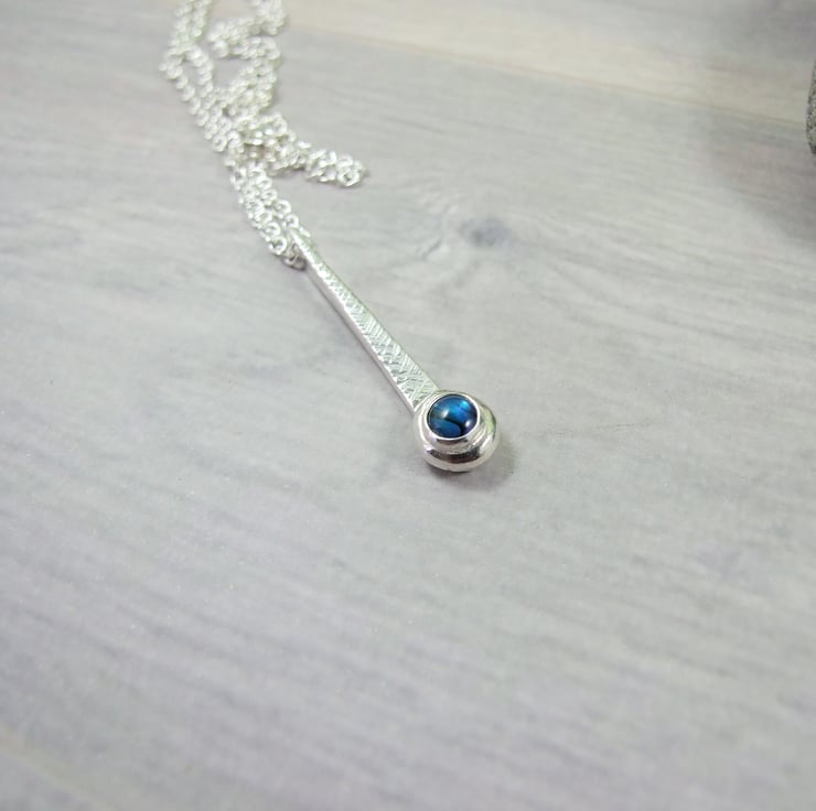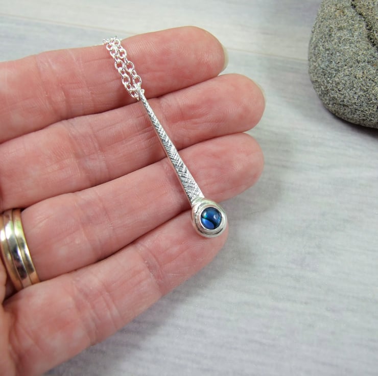 I have created the pendant from sterling silver wire forged to create a long teardrop shape then added some texture with a hammer. At the bottom of the teardrop I have added a small setting which holds a 5mm blue paua shell. Fitted to an 18 inch sterling silver chain.