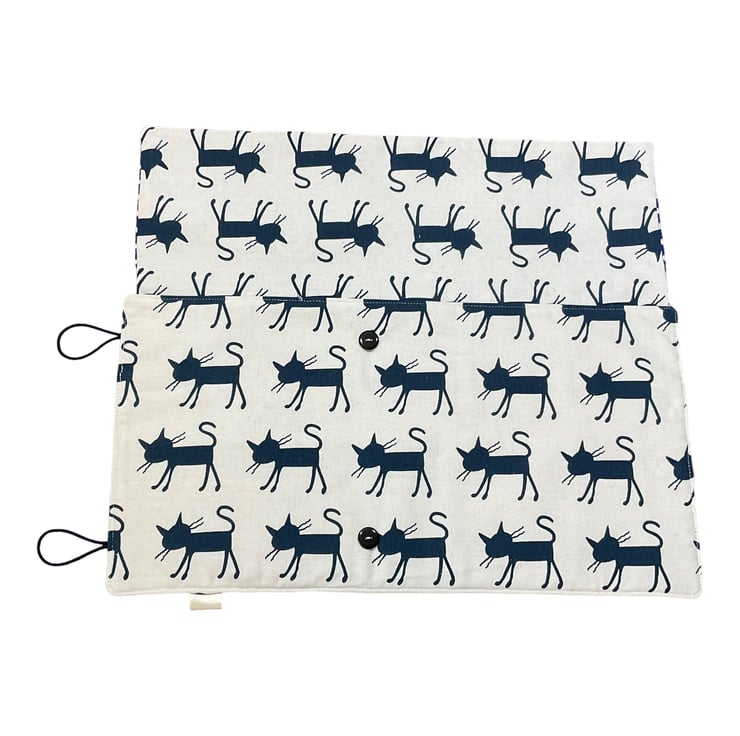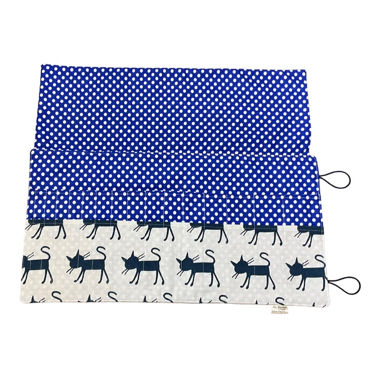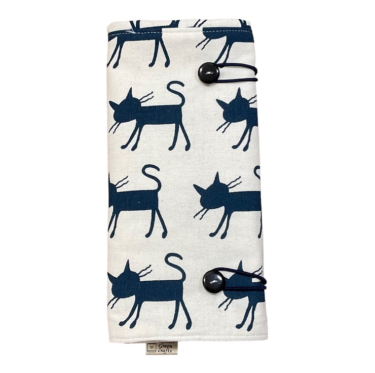 This case is made completely from heavy weight fabrics, using a cute cat print canvas fabric in navy blue on a natural cream base. The case can also be used for straight needles up to 25.5cm (10") or maybe crochet hooks.