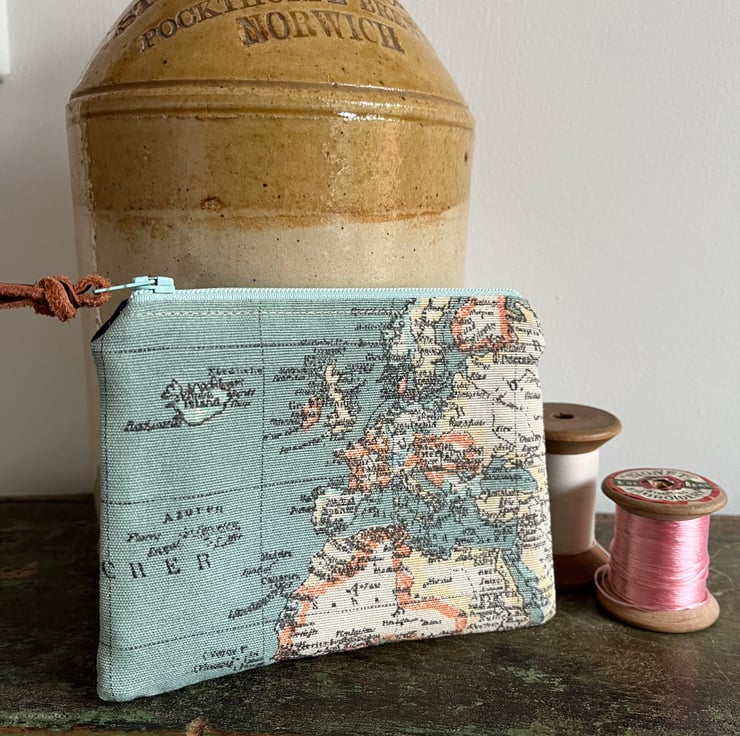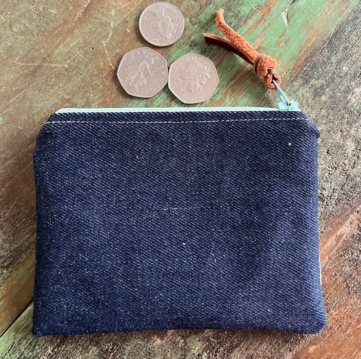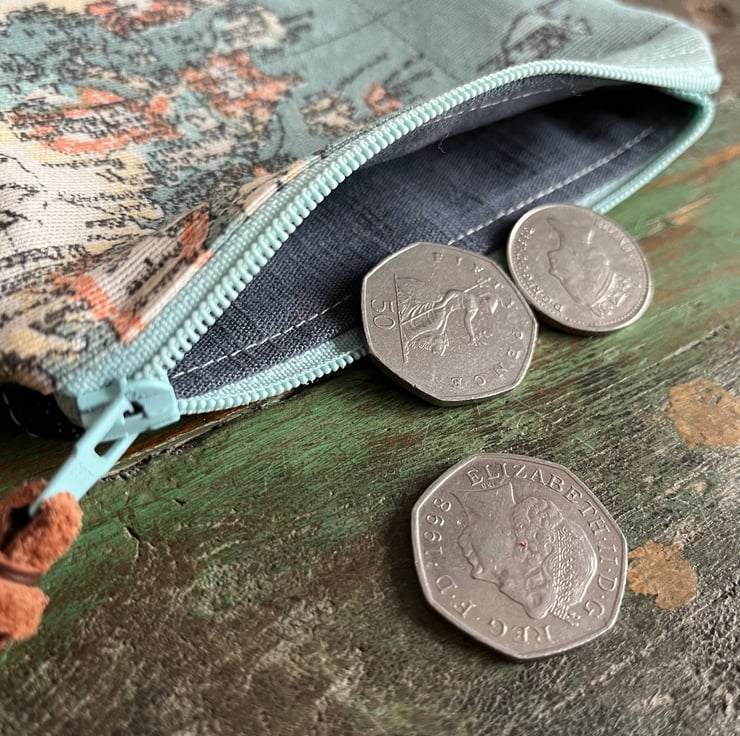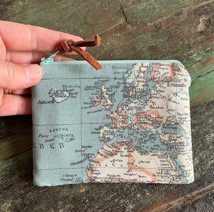 Cute little coin purse made from dark blue denim and map print cotton. It is lined with plain blue cotton-mix fabric.