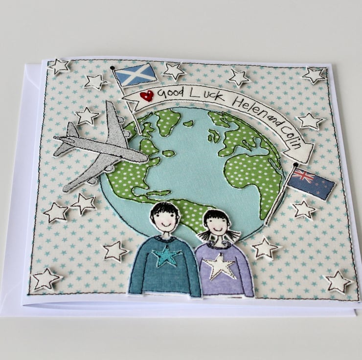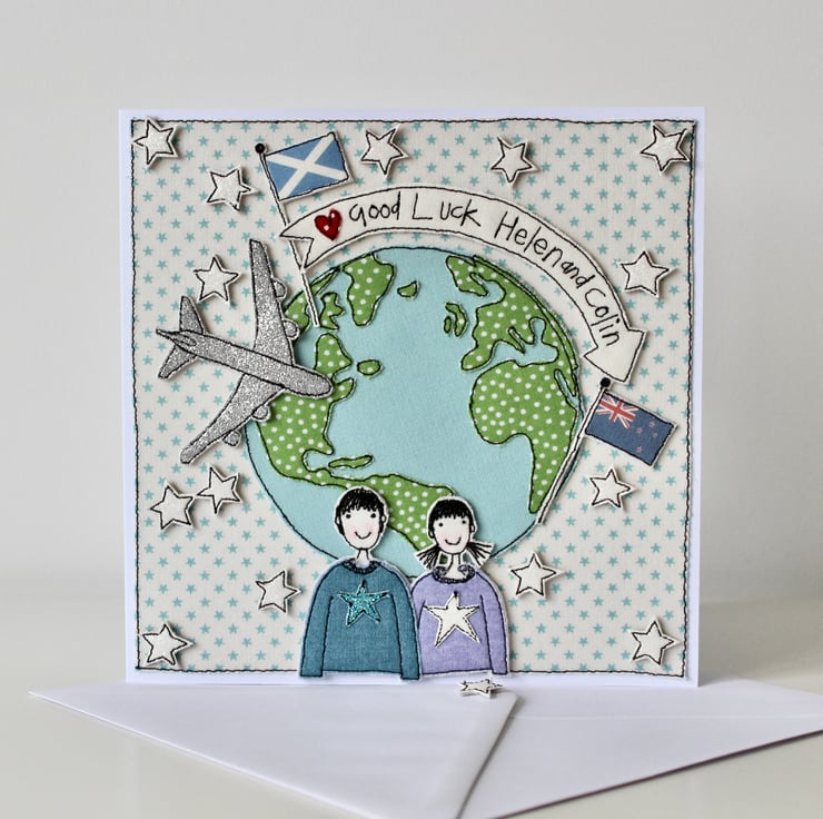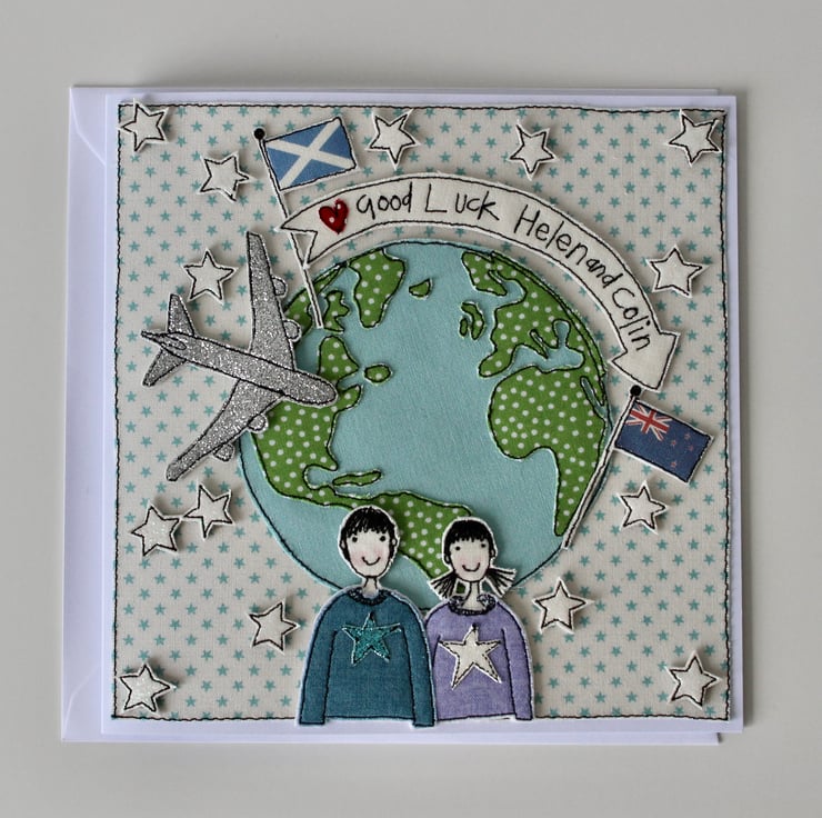 This card has been sewn by me and my sewing machine, using cotton cloth, metallic fabric, glitter cloth and 100% wool felt; making it totally unique.