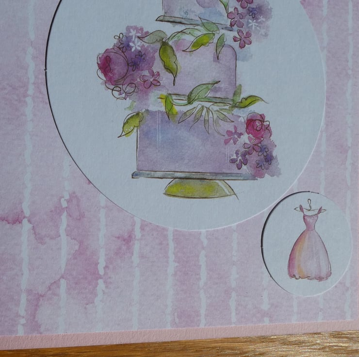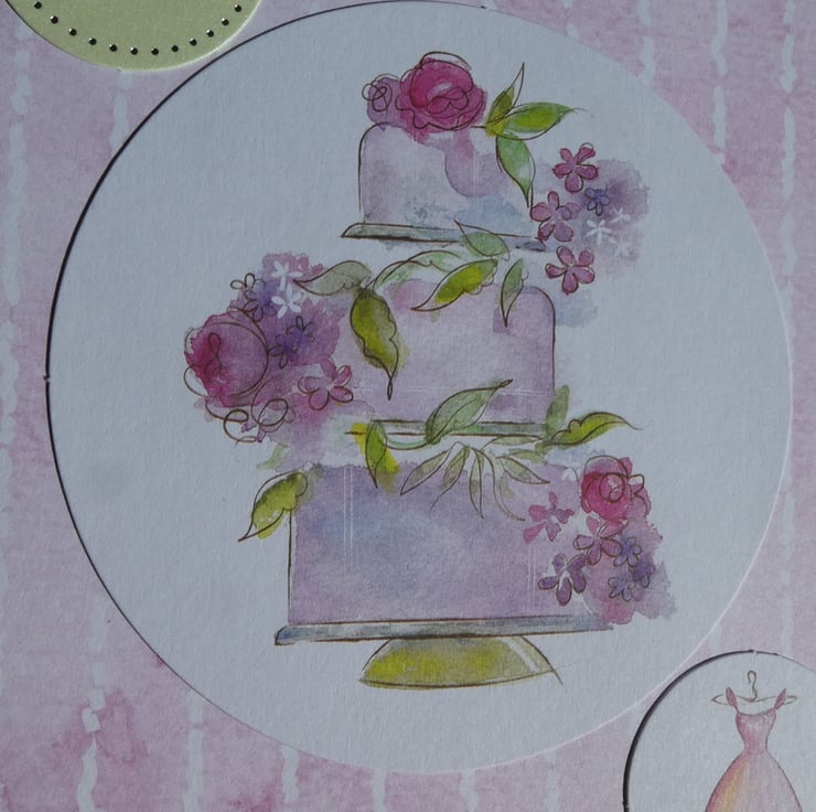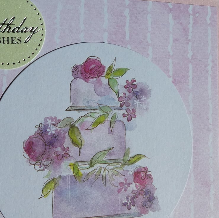 A layer of decorative paper printed with watercolour effect lilac and white stripes has been added to the front of the card. A circular printed image of a pink and purple cake on a green stand and decorated with flowers has then been added in the centre.