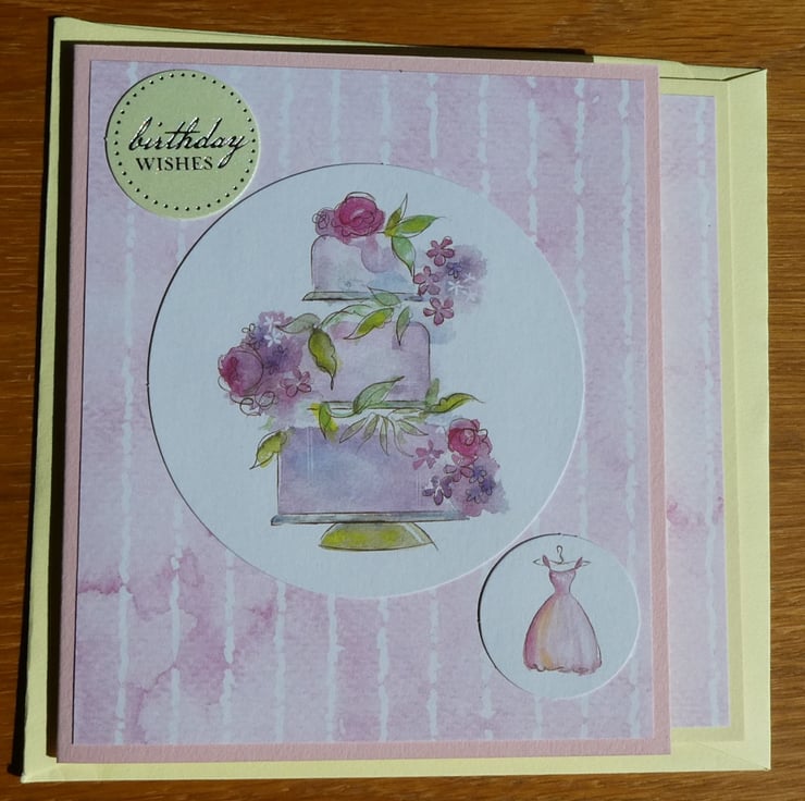 The front of the card has been finished with a circular greeting in silver lettering reading 'birthday wishes' on a pearlescent lime green background and a small printed image of a pink dress on a hanger.