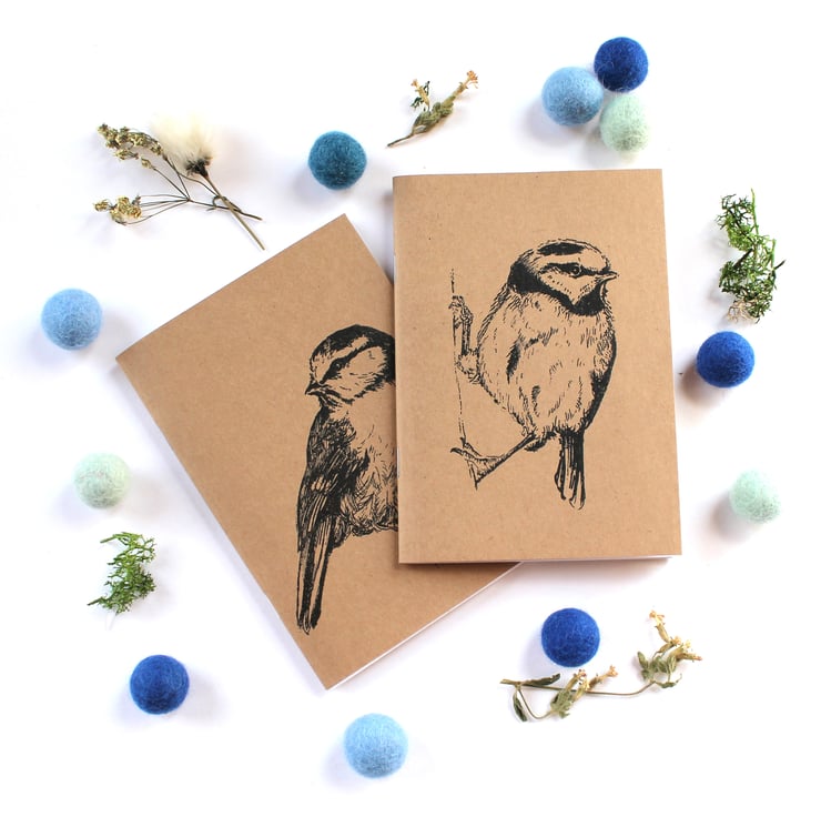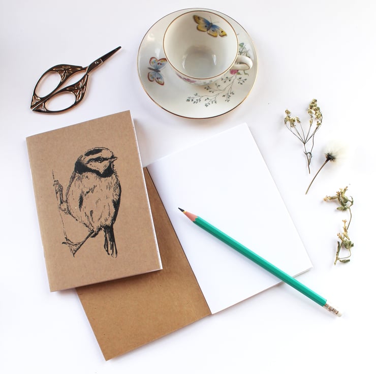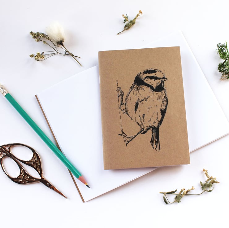 A6 Blue tit Pocket Notebook with Plain Pages printed in the UK from my original Blue tit gocco print, blue tits are common bird table visitors and often astound with their aerial acrobatics!
