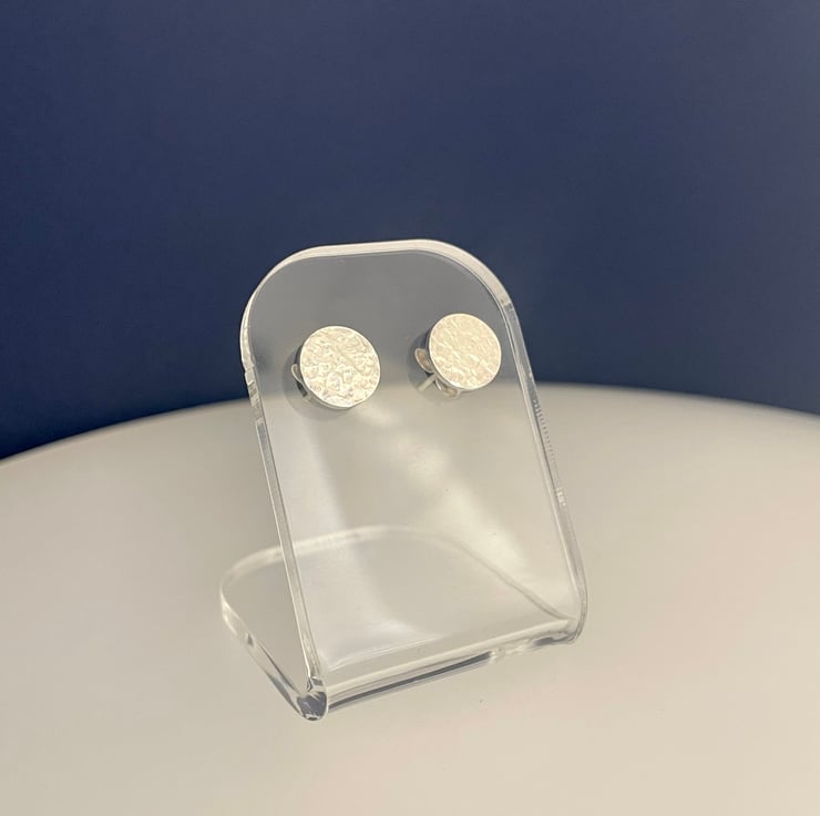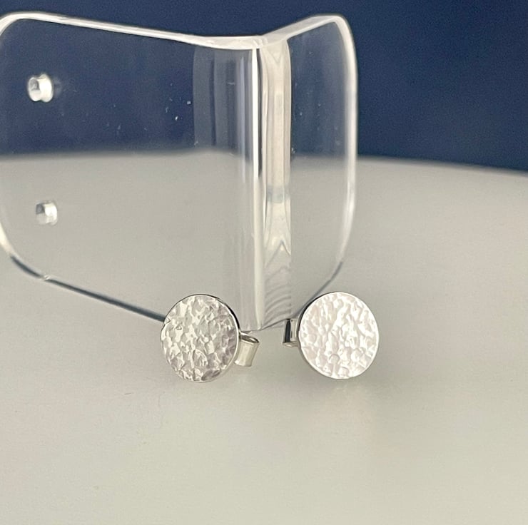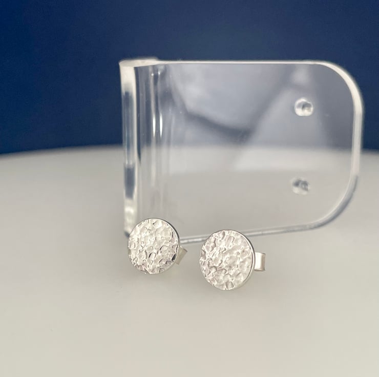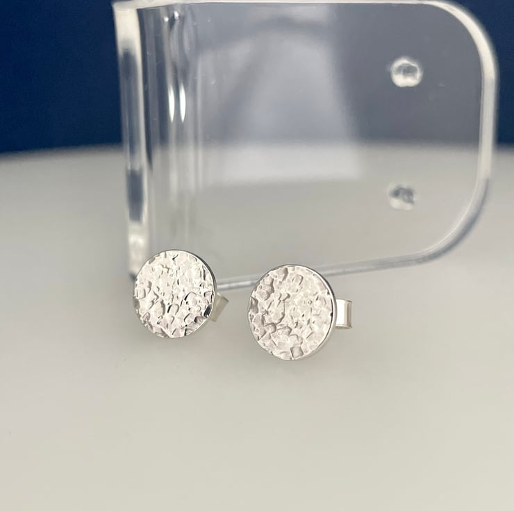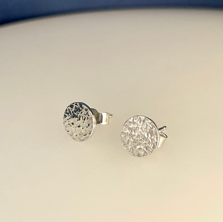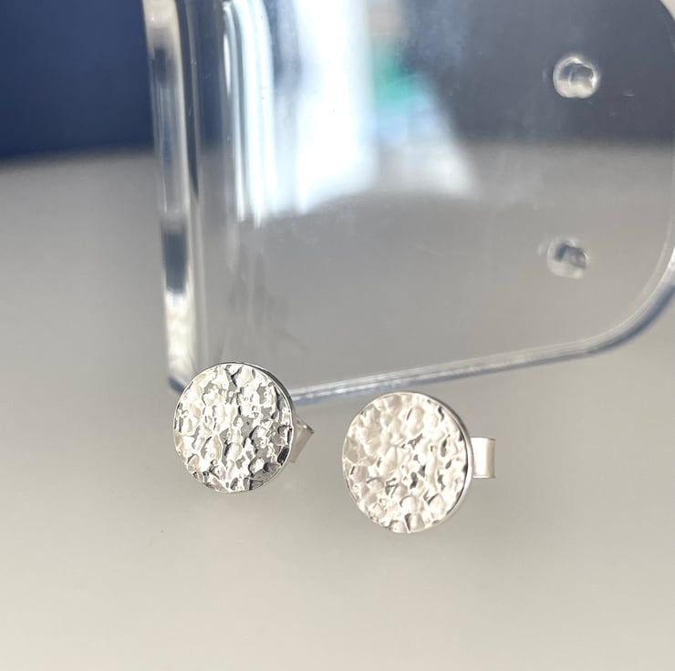 A lovely pair of round disc ear stud earrings handmade from 925 sterling. Cut out by hand from solid 1mm thick silver sheet then hammered to create their unique attractive sparkly textured surface.