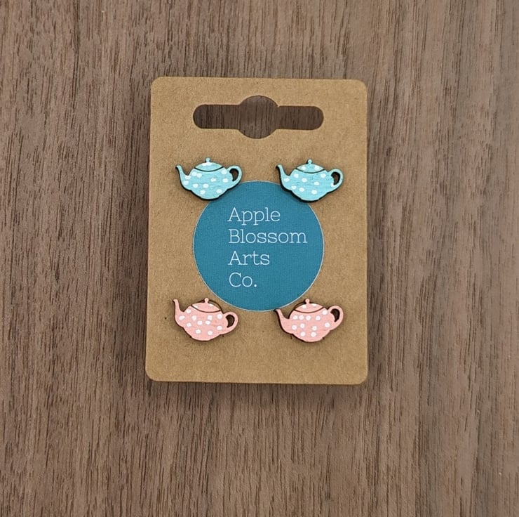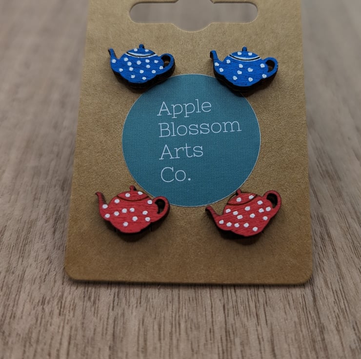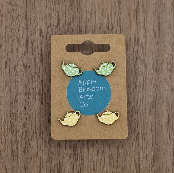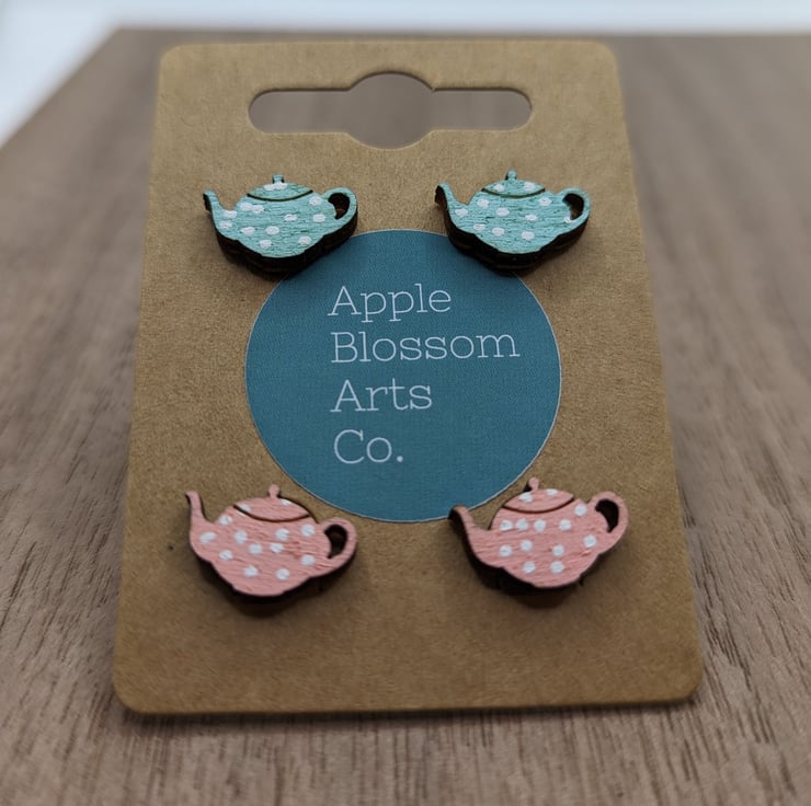 Stud earrings laser cut from 3mm birch. Measuring 11mm in diameter, backed with hypoallergenic stainless steel posts and butterfly backs. Each earring is stained and hand painted.