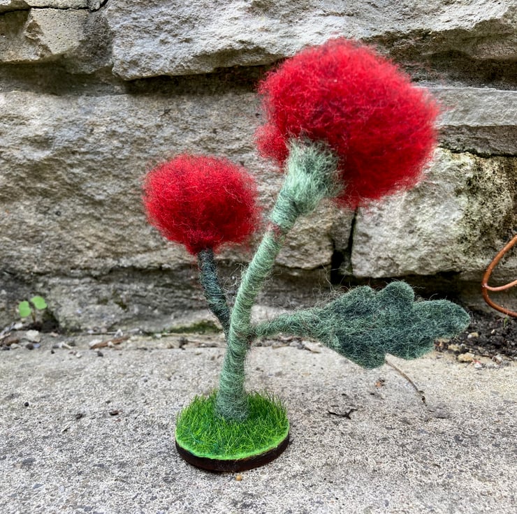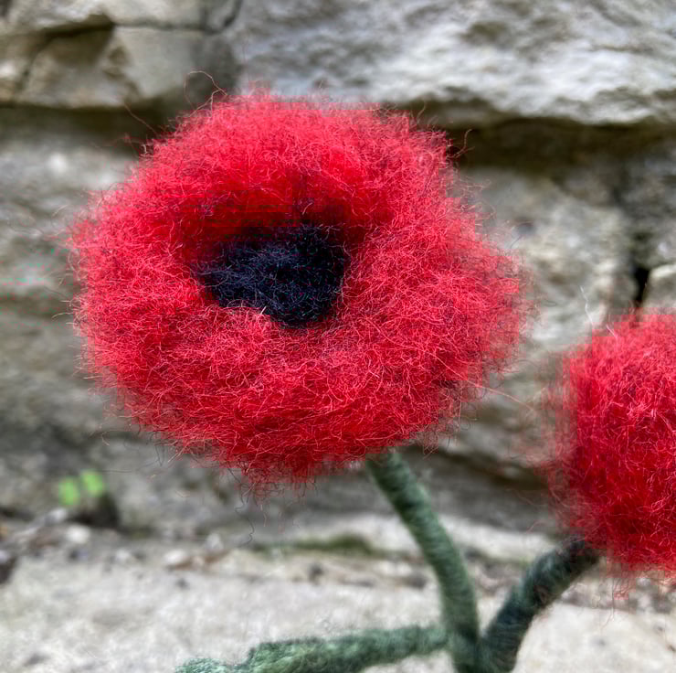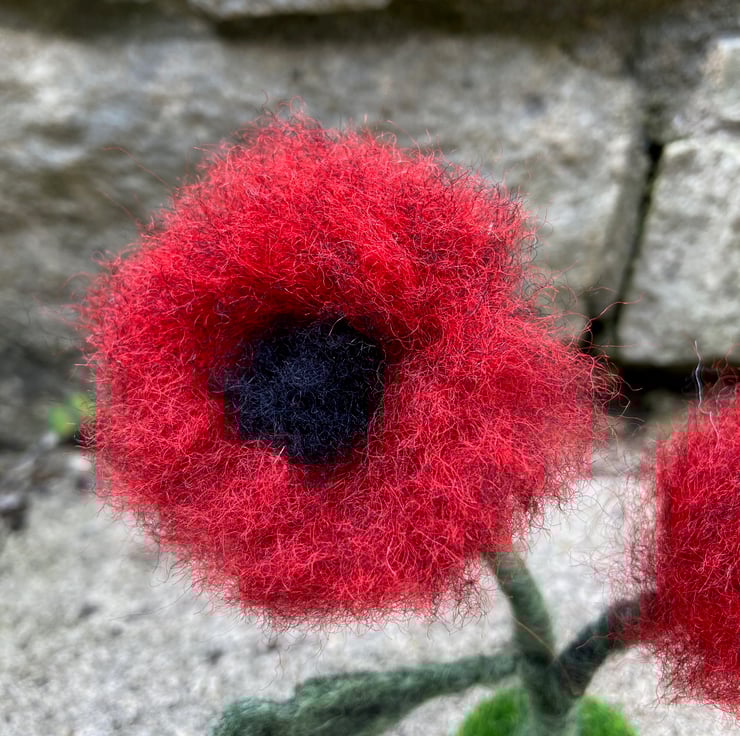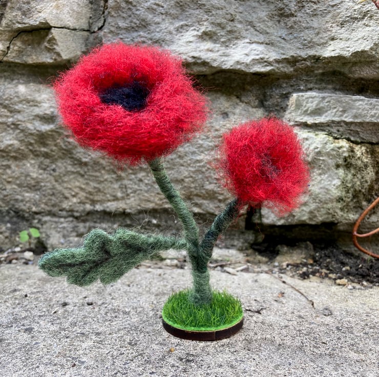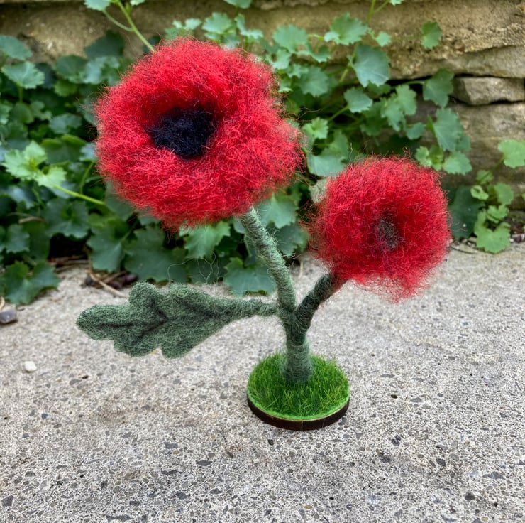 This pretty little poppy ornament is made from woollen fibres. Two wire stems wrapped in green fibres have been needle felted and loose red fibres needle felted to the ends to create the poppy petals. A black centre has been added along with a leaf cut from a piece of hand made felt. The poppies have then been mounted on a small wooden disc covered in artificial grass. The ornament measures approximately 14cm tall.