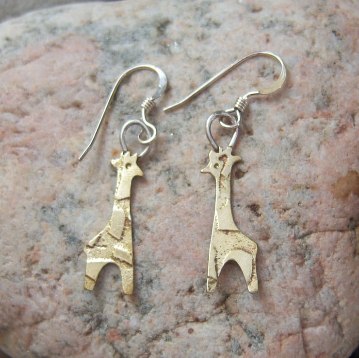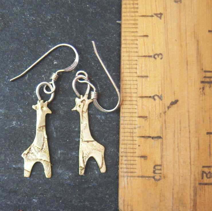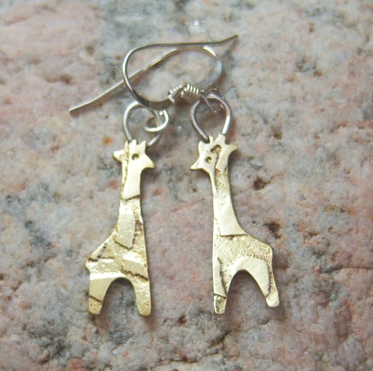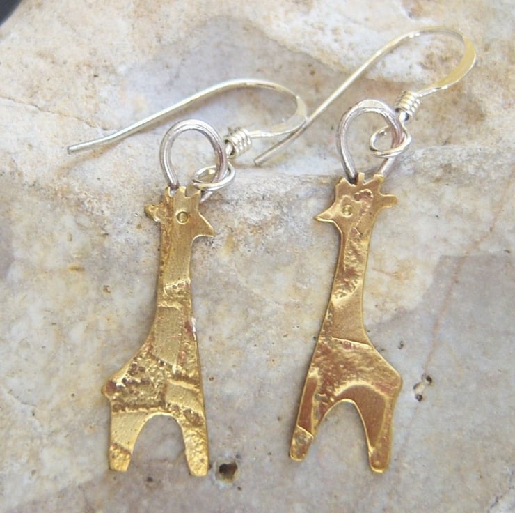 Giraffes cut from an etched brass sheet with a small jeweller's saw. Approximately 2cms tall. Sterling silver ear wires to finish.