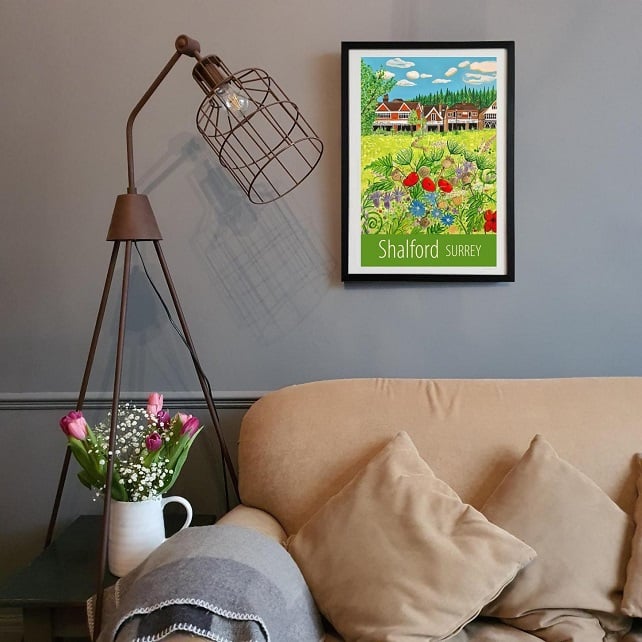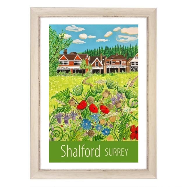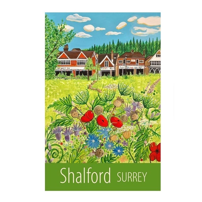 A travel poster print of the lovely Shalford, Surrey, through the wildflowers across the green to the Snooty Fox, from my own original acrylic painting.