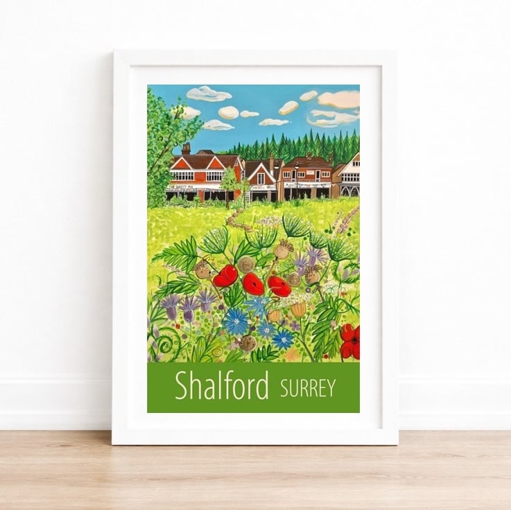 A travel poster print of the lovely Shalford, Surrey, through the wildflowers across the green to the Snooty Fox, from my own original acrylic painting. A perfect gift for those who love Shalford!
